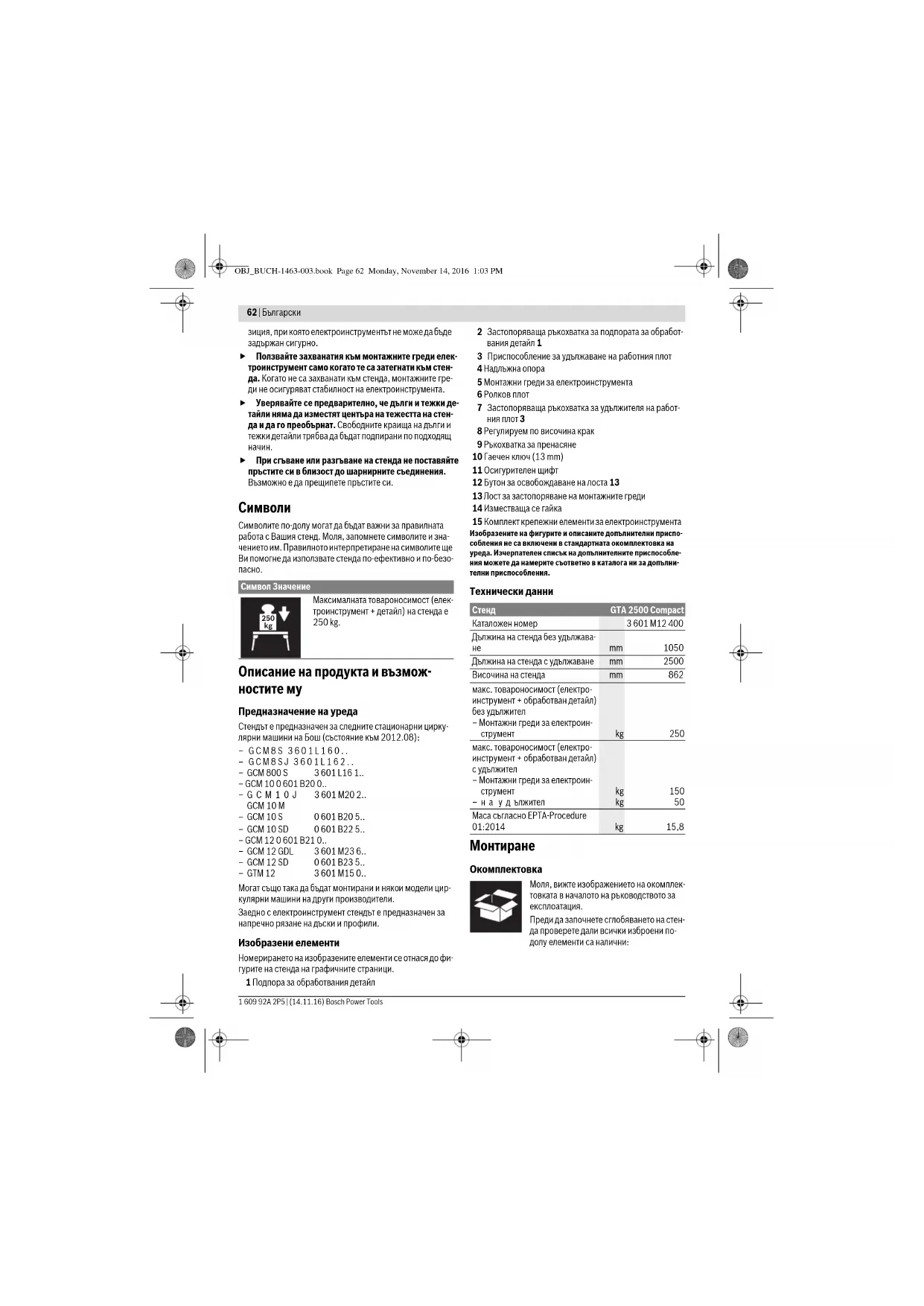 Маса съгласно EPTA-Procedure 01:2014 kg 15,8 OBJ_BUCH-1463-003.book Page 62 Monday, November 14, 2016 1:03 PMБългарски | 63 Bosch Power Tools 1 609 92A 2P5 | (14.11.16) Монтиране на стенда – Извадете внимателно всички включени в окомплектов- ката детайли. – Отстранете всички опаковъчни материали. Сглобяване на стенда (вижте фигури A1–A2) – Поставете стенда легнал на земята с краката нагоре. – Натиснете осигурителния щифт 11 навътре и завъртете крака нагоре, докато осигурителният щифт го захване с отчетливо прещракване. – Повторете горната стъпка при останалите три крака. –Завъртете стенда до работна позиция. – Уверете се, че стендът е стабилен и всички осигурител- ни щифтове са в правилна позиция. Регулируемият по височина крак 8 Ви помага да нивели- рате и стабилизирате стенда. – Навийте или развийте крака, докато стендът стъпи на пода стабилно на четирите си крака. Монтиране на подпората за обработвания детайл (вижте фиг. В) – Вкарайте подпората 1 в удължителя на работния плот 3. –Затегнете ръкохватката 2, за да застопорите подпората. – Повторете горните стъпки за втората подпора. Подготовка на работния плот Подготовка на монтажните греди (вижте фигури C1–C4) – За освобождаване на монтажните греди 5 натиснете съ- ответно бутоните 12 и отворете лостовете 13. – Измерете разстоянието х между монтажните отвори на Вашия електроинструмент. – Поставете монтажните греди 5 приблизително по сре- дата на стенда и на подходящо разстояние x една от
