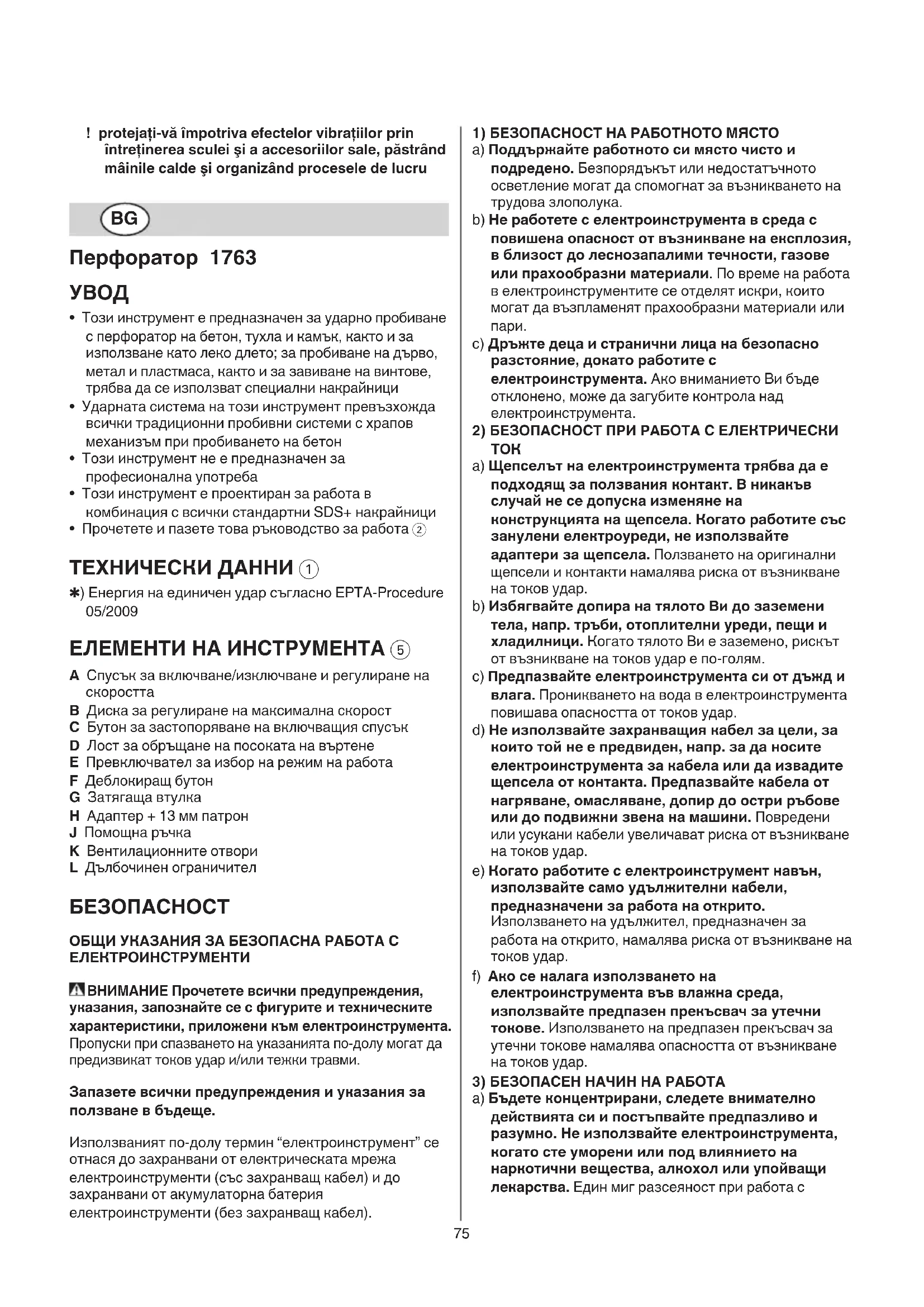 - Прочетете и пазете това ръководство за работа 2 ТЕXHИЧЕСКИ ДАННИ 1 ✱) Енергия на единичен удар съгласно EPTA-Procedure 05/2009 ЕЛЕМЕНТИ НА ИНСТРУМЕНТА 5 A Спусък за включване/изключване и pегулиpане на скоpостта B Диска за pегулиpане на максимална скоpост C Бутон за застопоpяване на включващия спусък D Лост за обpъщане на посоката на въpтене E Превключвател за избор на режим на работа F Деблокиращ бутон G Затягаща втулка H Адаптер + 13 мм патрон J Помощна ръчка K Вентилационните отвоpи L Дълбочинен ограничител БЕЗОПАСНОСТ ОБЩИ УКАЗАНИЯ ЗА БЕЗОПАСНА РАБОТА С ЕЛЕКТРОИНСТРУМЕНТИ ВНИМАНИЕ Прочетете всички предупреждения, указания, запознайте се с фигурите и техническите характеристики, приложени към електроинструмента. Пропуски при спазването на указанията по-долу могат да предизвикат токов удар и/или тежки травми. Запазете всички предупреждения и указания за ползване в бъдеще. Използваният по-долу термин “електроинструмент” се отнася до захранвани от електрическата мрежа електроинструменти (със захранващ кабел) и до захранвани от акумулаторна батерия електроинструменти (без захранващ кабел).