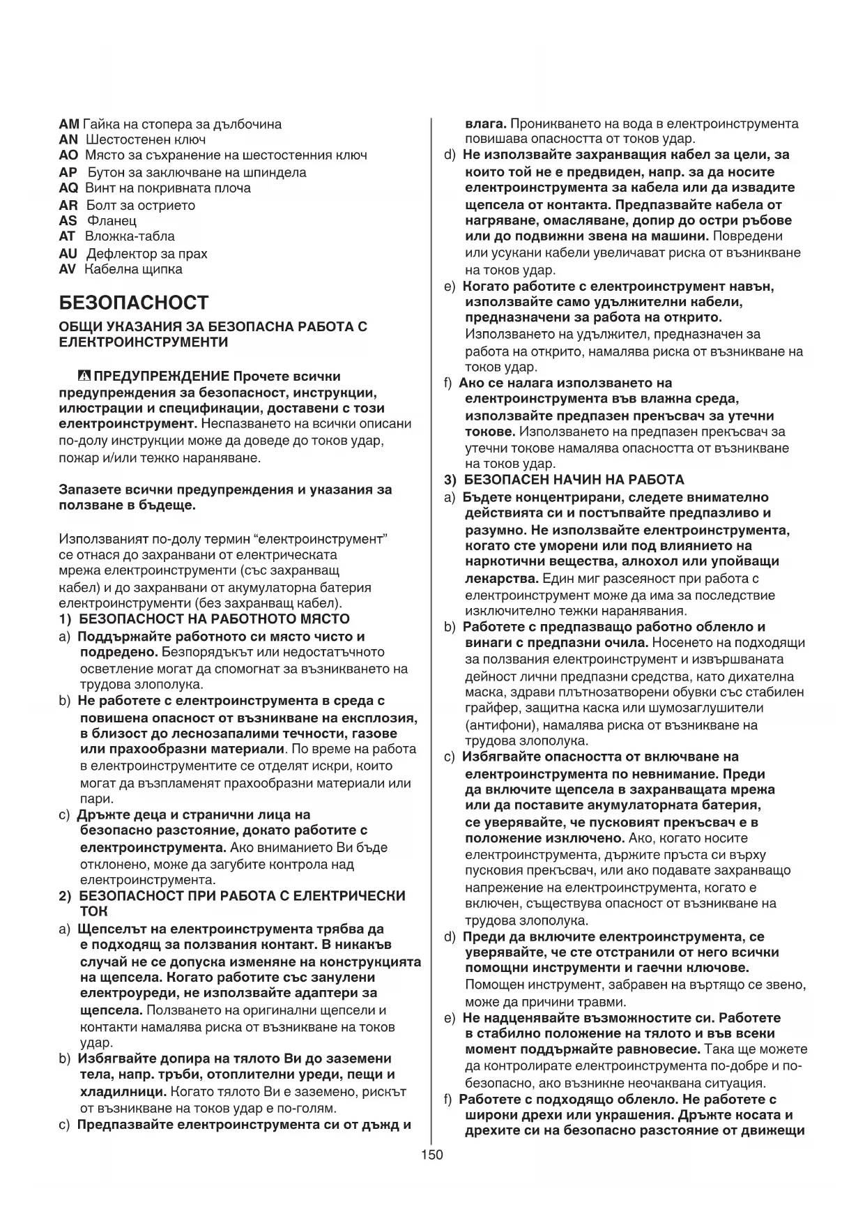 a) Бъдете концентрирани, следете внимателно действията си и постъпвайте предпазливо и разумно. Не използвайте електроинструмента, когато сте уморени или под влиянието на наркотични вещества, алкохол или упойващи лекарства. Един миг разсеяност при работа с електроинструмент може да има за последствие изключително тежки наранявания. b) Работете с предпазващо работно облекло и винаги с предпазни очила. Носенето на подходящи за ползвания електроинструмент и извършваната дейност лични предпазни средства, като дихателна маска, здрави плътнозатворени обувки със стабилен грайфер, защитна каска или шумозаглушители (антифони), намалява риска от възникване на трудова злополука. c) Избягвайте опасността от включване на електроинструмента по невнимание. Преди да включите щепсела в захранващата мрежа или да поставите акумулаторната батерия, се уверявайте, че пусковият прекъсвач е в положение изключено. Ако, когато носите електроинструмента, държите пръста си върху пусковия прекъсвач, или ако подавате захранващо напрежение на електроинструмента, когато е включен, съществува опасност от възникване на трудова злополука. d) Преди да включите електроинструмента, се уверявайте, че сте отстранили от него всички помощни инструменти и гаечни ключове. Помощен инструмент, забравен на въртящо се звено, може да причини травми. e) Не надценявайте възможностите си. Работете в стабилно положение на тялото и във всеки момент поддържайте равновесие. Така ще можете да контролирате електроинструмента по-добре и по- безопасно, ако възникне неочаквана ситуация. f) Работете с подходящо облекло. Не работете с широки дрехи или украшения. Дръжте косата и дрехите си на безопасно разстояние от движещи AM Гайка на стопера за дълбочина AN Шестостенен ключ AO Място за съхранение на шестостенния ключ AP Бутон за заключване на шпиндела AQ Винт на покривната плоча AR Болт за острието AS Фланец AT Вложка-табла AU Дефлектор за прах AV Кабелна щипка БЕЗОПАСНОСТ ОБЩИ УКАЗАНИЯ ЗА БЕЗОПАСНА РАБОТА С ЕЛЕКТРОИНСТРУМЕНТИ - ПРЕДУПРЕЖДЕНИЕ Прочете всички предупреждения за безопасност, инструкции, илюстрации и спецификации, доставени с този електроинструмент. Неспазването на всички описани по-долу инструкции може да доведе до токов удар, пожар и/или тежко нараняване. Запазете всички предупреждения и указания за ползване в бъдеще. Използваният по-долу термин “електроинструмент” се отнася до захранвани от електрическата мрежа електроинструменти (със захранващ кабел) и до захранвани от акумулаторна батерия електроинструменти (без захранващ кабел).