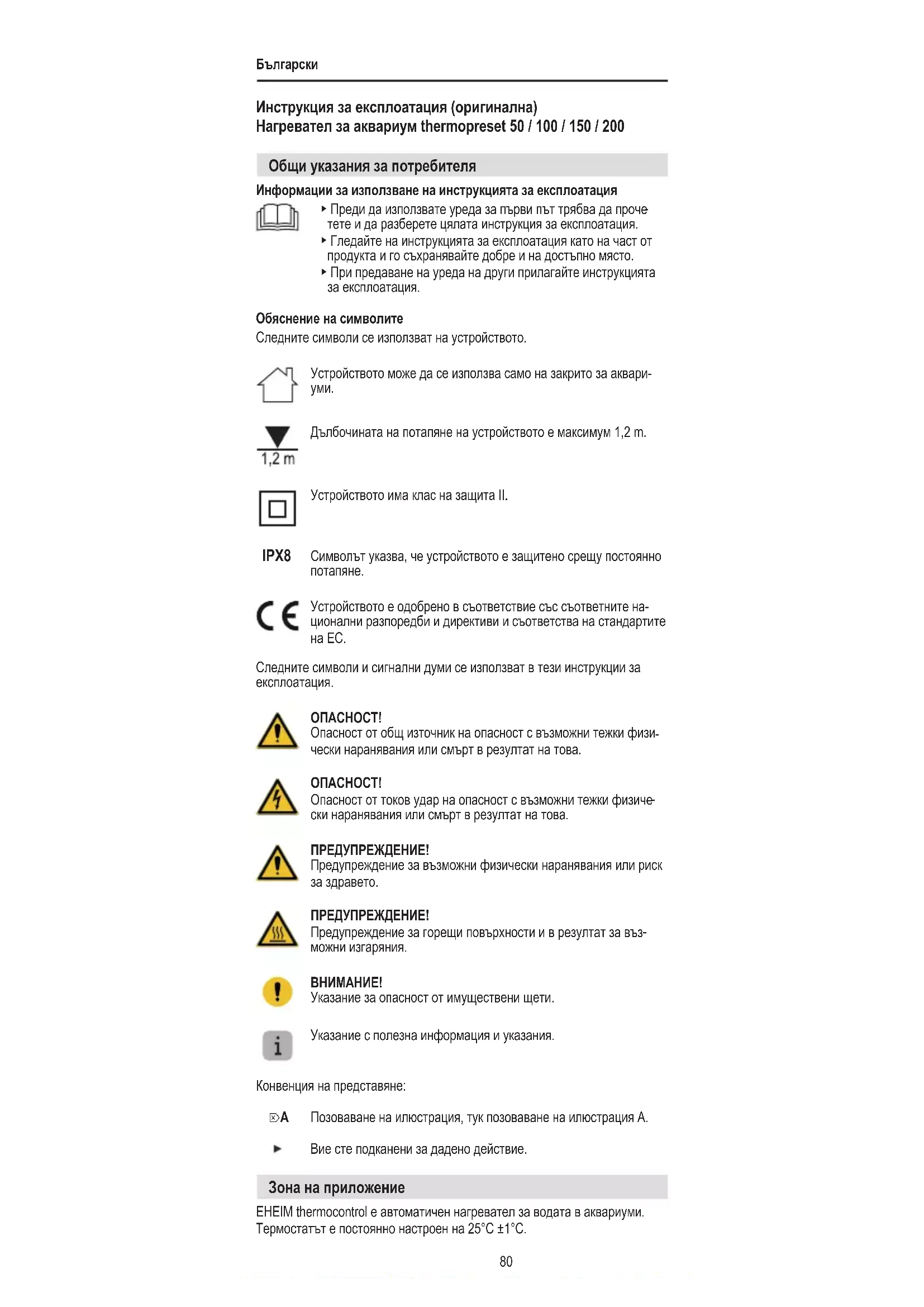 назначени за частна употреба и могат да се използват само: ‧ за аквариумни цели ‧ във вътрешни помещения ‧ в съответствие с техническите данни Следните ограничения важат за устройството: ‧ не използвайте за търговски или промишлени цели ‧ Не трябва да се затоплят разяждащи, лесно запалими, агресивни или експлозивни вещества, хранителни продукти, както и питейна вода ‧ температурата на водата не трябва да надвишава 35 °C ‧ никога не го използвайте извън вода