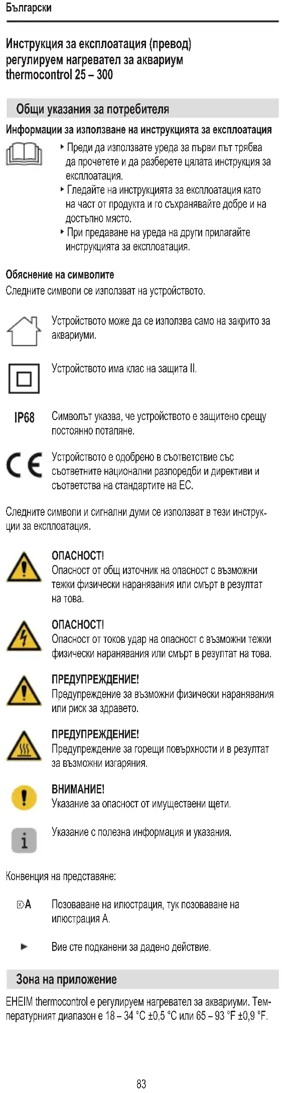Инструкция за експлоатация (превод) регулируем нагревател за аквариум thermocontrol 25 – 300 Общи указания за потребителя Информации за използване на инструкцията за експлоатация ▶ Преди да използвате уреда за първи път трябва да прочетете и да разберете цялата инструкция за експлоатация. ▶ Гледайте на инструкцията за експлоатация като на част от продукта и го съхранявайте добре и на достъпно място. ▶ При предаване на уреда на други прилагайте инструкцията за експлоатация. Обяснение на символите Следните символи се използват на устройството. Устройството може да се използва само на закрито за