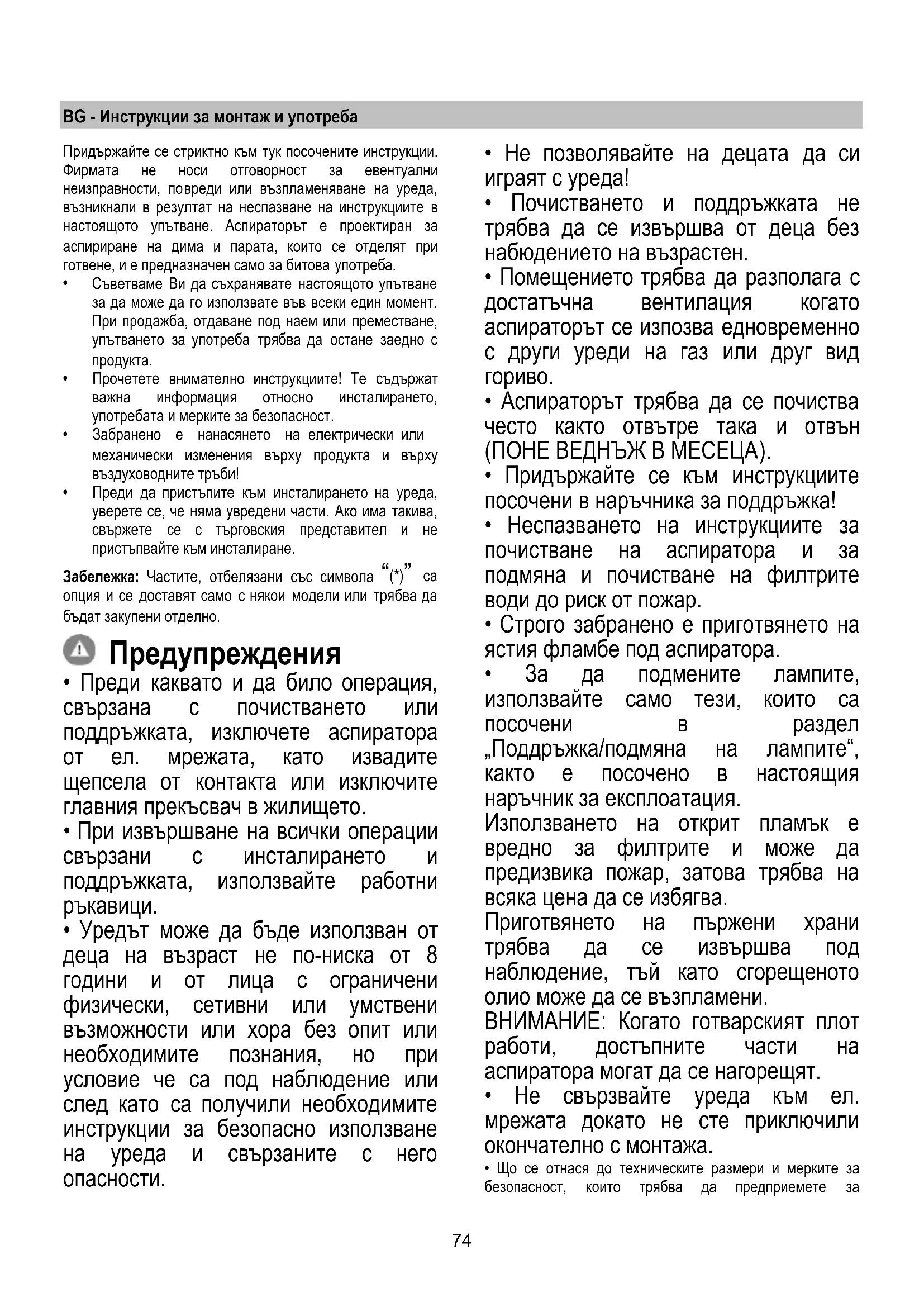 - Не използвайте и не оставяйте аспиратора без правилно монтирани лампички поради евентуален риск от токов