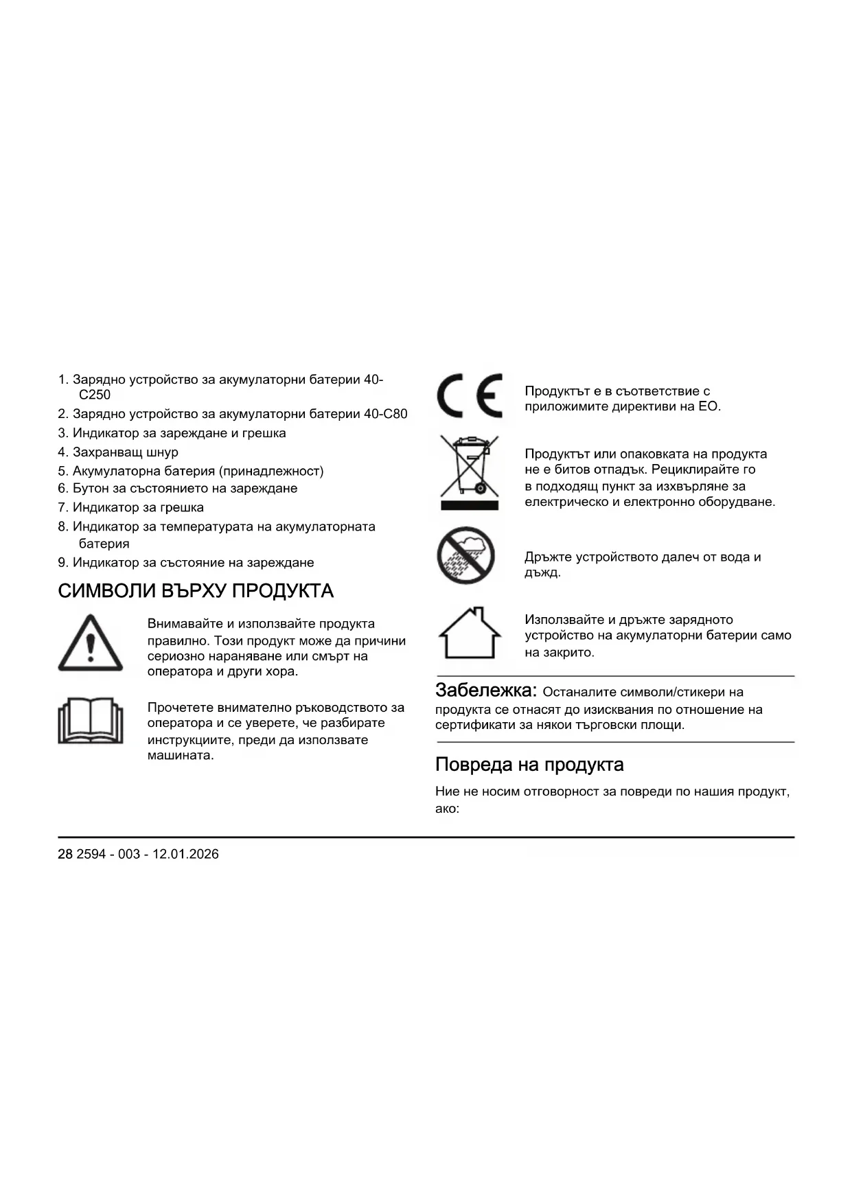 Използвайте и дръжте зарядното устройство на акумулаторни батерии само на закрито. Забележка: Останалите символи/стикери на продукта се отнасят до изисквания по отношение на сертификати за някои търговски площи. Повреда на продукта Ние не носим отговорност за повреди по нашия продукт,