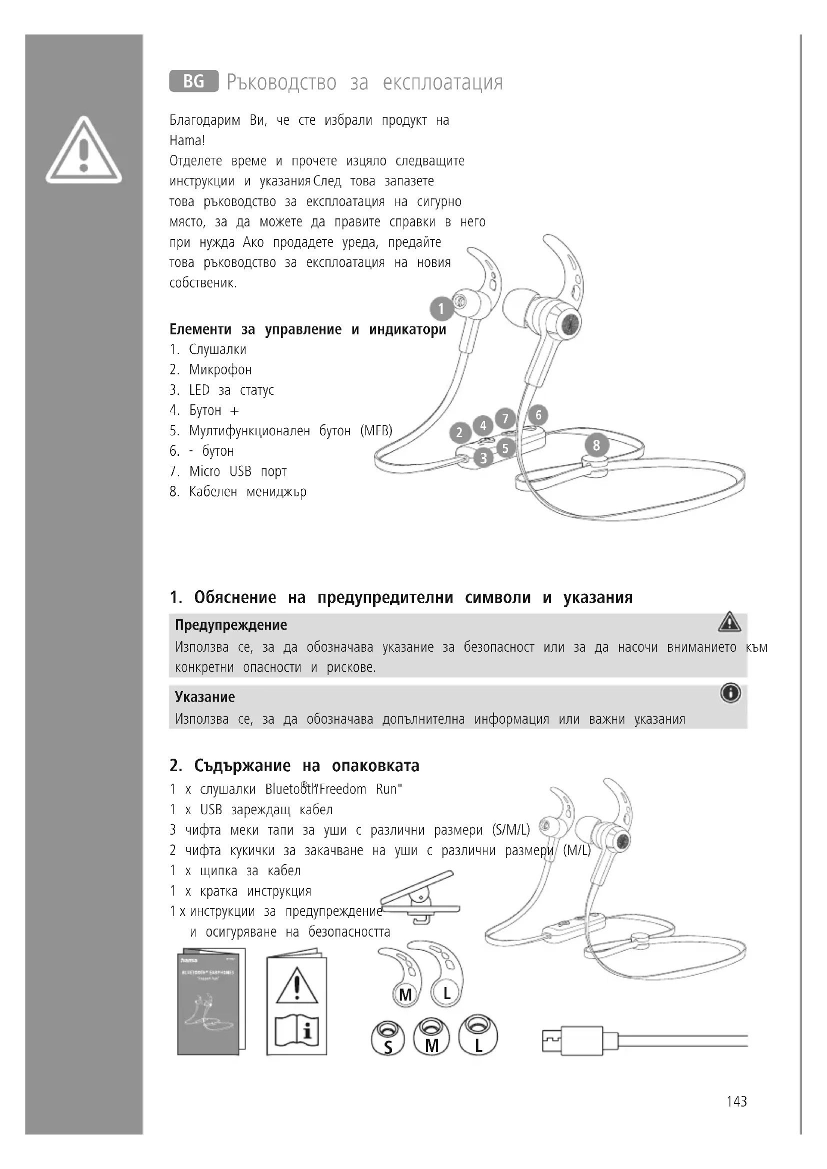 "Freedom Run" 1 x USB зареждащ кабел 3 чифта меки тапи за уши с различни размери (S/M/L) 2 чифта кукички за закачване на уши с различни размери (M/L) 1 х щипка за кабел 1 x кратка инструкция 1 x инструкции за предупреждение и осигуряване на безопасността