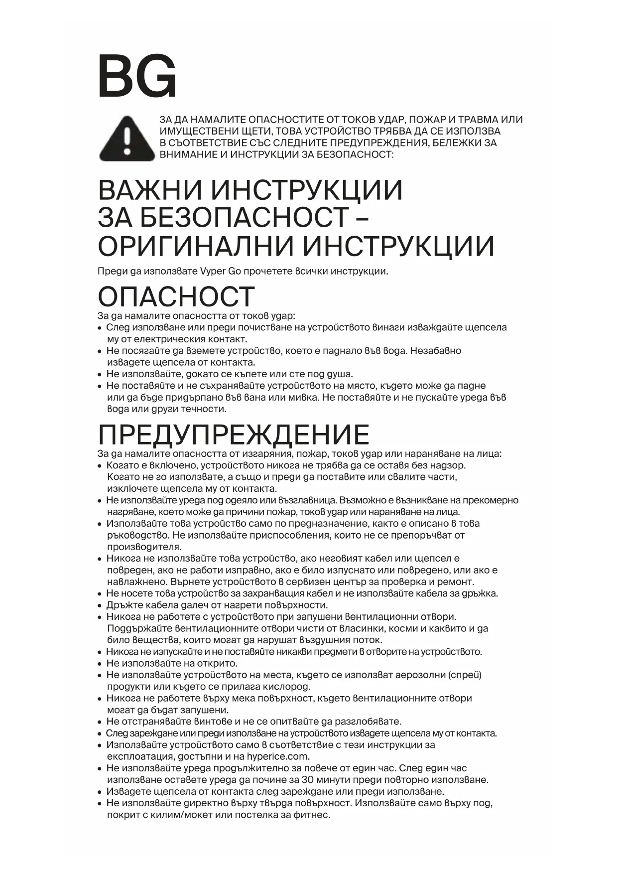 - Моля, не използвайте Vyper Go или което и да е високоинтензивно вибрационно устройство за упражнения, без първо да се консултирате с Вашия лекар, ако важи някое от следните: бременност, диабет с усложнения, като невропатия или увреждане на ретината, използване на пейсмейкъри, скорошна операция или нараняване, епилепсия или мигрена, дискови хернии, спондилолистеза, спондилолиза или спондилоза, скорошни смени на стави, вътрематочна спирала, метални щифтове или плочи или всякакви притеснения относно Вашето физическо здраве. Слаби физически лица и деца трябва да бъдат придружавани от възрастен, когато използват вибрационно устройство. Тези противопоказания не означават, че не можете да използвате вибрационно или друго устройство за физическа тренировка, но Ви съветваме преди това да се консултирате с лекаря си. Провеждат се текущи изследвания за ефектите от вибрационните тренировки при специфични медицински разстройства. Това вероятно ще доведе до съкращаване на горепосочения списък на противопоказанията. Практическият опит показва, че интегрирането на вибриращо фитнес устройство в план за лечение в редица случаи е препоръчително. Това трябва да се направи по съвет и в присъствието на лекар, специалист или физиотерапевт. Vyper Go трябва да се зарежда единствено чрез 18VDC зарядното устройство с двойна изолация Hyperice (номер на модел MX24Z2-1801000), което е предоставено с уреда. Не зареждайте Vyper Go през нощта и не оставяйте Vyper Go без надзор, когато го зареждате или използвате. Vyper Go съдържа батерия, която трябва да бъде безопасно обработена в подходящ пункт за обезвреждане или рециклиране на електронно оборудване.