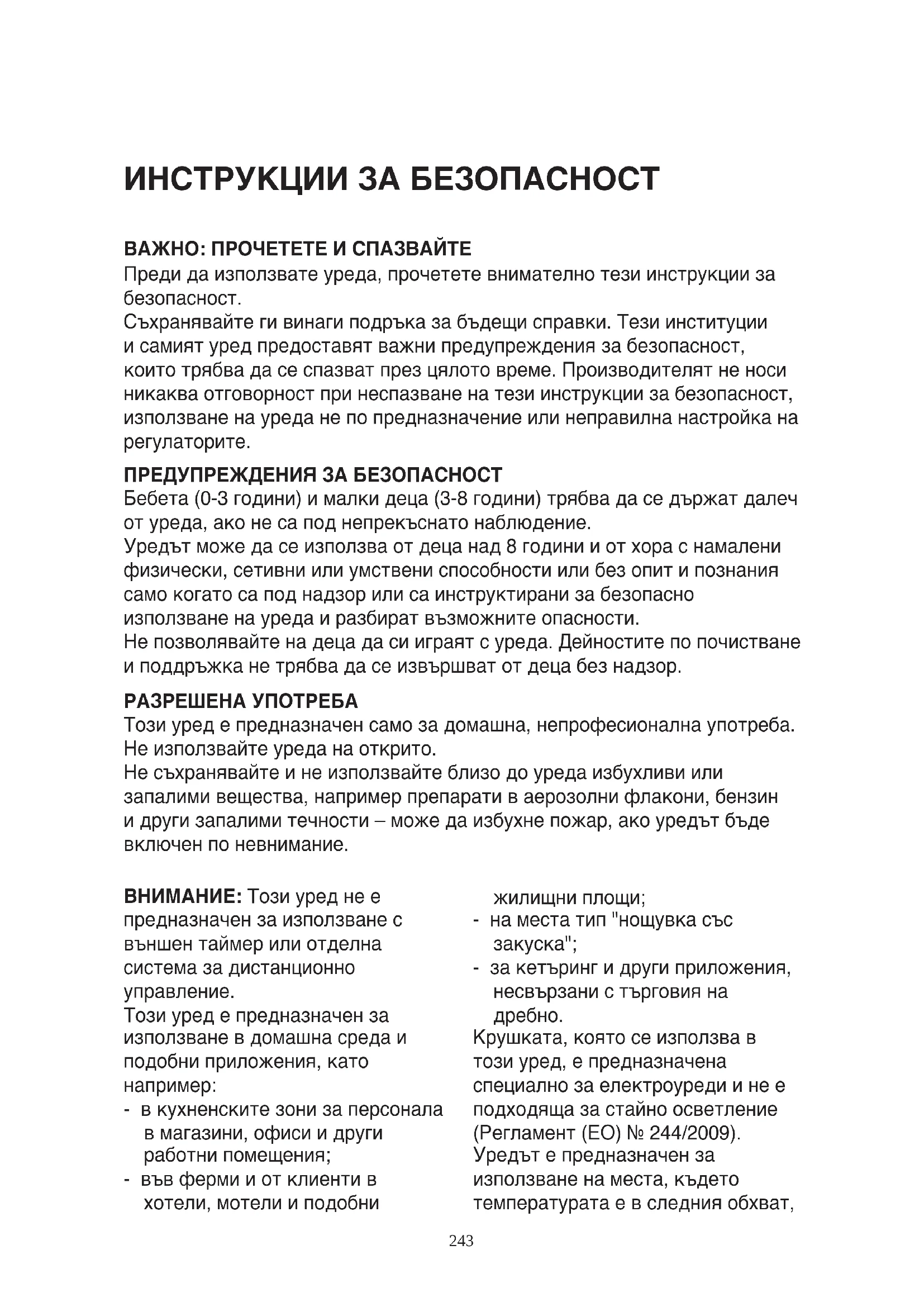 ВЫРАВНИВАНИЕ ПРИБОРА Выровняйте прибор с помощью двух регулировочных ножек, расположенных с его нижней стороны. Если не выровнять прибор, не будет надлежащего прилегания дверец и магнитных прокладок.243 ИНСТРУКЦИИ ЗА БЕЗОПАСНОСТ ВАЖНО: ПРОЧЕТЕТЕ И СПАЗВАЙТЕ Преди да използвате уреда, прочетете внимателно тези инструкции за безопасност. Съхранявайте ги винаги подръка за бъдещи справки. Тези институции и самият уред предоставят важни предупреждения за безопасност, които трябва да се спазват през цялото време. Производителят не носи никаква отговорност при неспазване на тези инструкции за безопасност, използване на уреда не по предназначение или неправилна настройка на регулаторите. ПРЕДУПРЕЖДЕНИЯ ЗА БЕЗОПАСНОСТ Бебета (0-3 години) и малки деца (3-8 години) трябва да се държат далеч от уреда, ако не са под непрекъснато наблюдение. Уредът може да се използва от деца над 8 години и от хора с намалени физически, сетивни или умствени способности или без опит и познания само когато са под надзор или са инструктирани за безопасно използване на уреда и разбират възможните опасности. Не позволявайте на деца да си играят с уреда. Дейностите по почистване и поддръжка не трябва да се извършват от деца без надзор. РАЗРЕШЕНА УПОТРЕБА Този уред е предназначен само за домашна, непрофесионална употреба. Не използвайте уреда на открито. Не съхранявайте и не използвайте близо до уреда избухливи или запалими вещества, например препарати в аерозолни флакони, бензин и други запалими течности – може да избухне пожар, ако уредът бъде включен по невнимание. ВНИМАНИЕ: Този уред не е предназначен за използване с външен таймер или отделна система за дистанционно управление. Този уред е предназначен за използване в домашна среда и подобни приложения, като