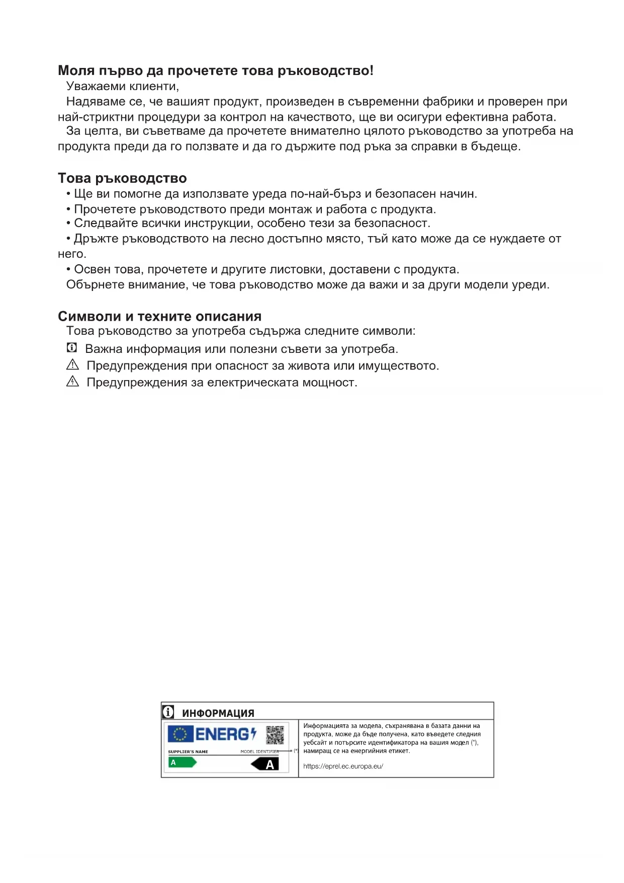 Информацията за модела, съхранявана в базата данни на продукта, може да бъде получена, като въведете следния уебсайт и потърсите идентификатора на вашия модел (*), намиращ се на енергийния етикет. https://eprel.ec.europa.eu/BG