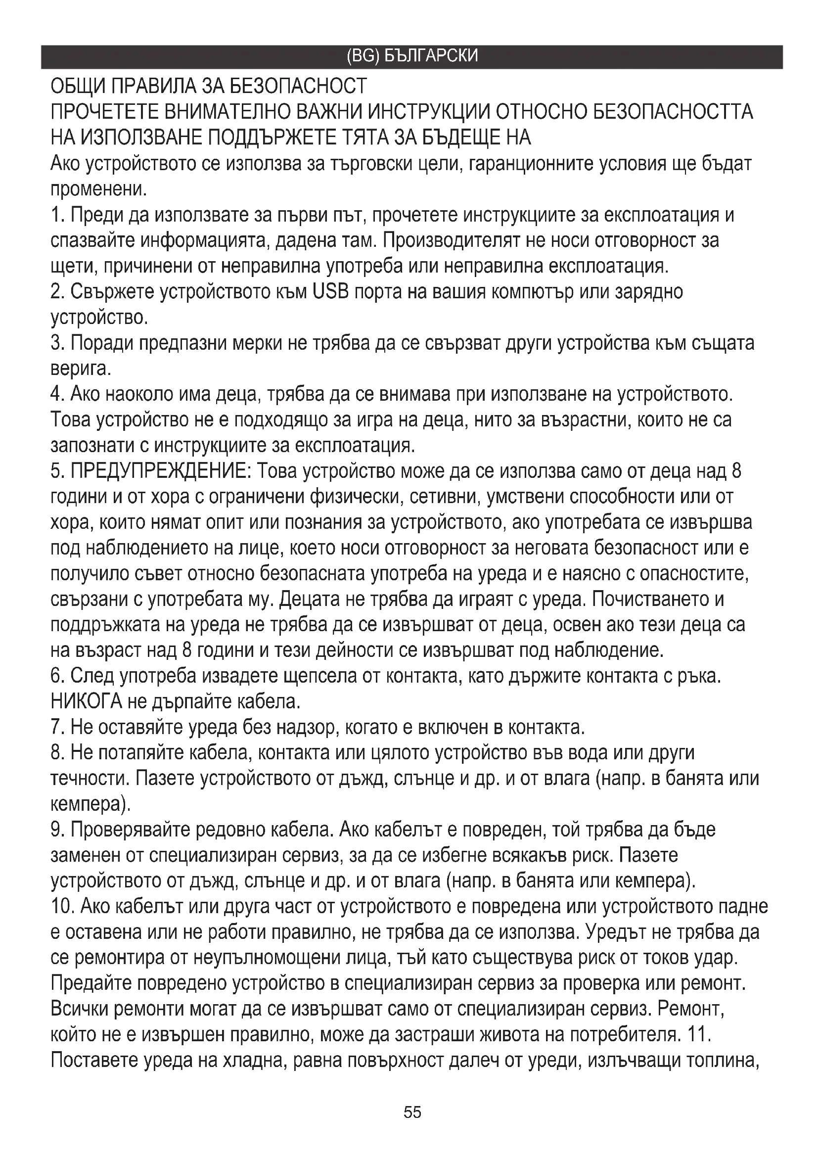ﯾﺪﮭﺗ تﺎﻧﻮﻜﻤﻟا ﻞﻜﺸﺗ ﺪﻗ زﺎﮭﺠﻟا ﻲﻓ تﺎﯾرﺎﻄﺑ كﺎﻨھ نﺎﻛ اذإ .ﺎﮭﻣاﺪﺨﺘﺳاو ﺎﮭﻣاﺪﺨﺘﺳا ةدﺎﻋإ ، ﻞﻜﺸﺑ ﺔﻧﺰﺨﻤﻟا ﺔﻄﻘﻨﻟا ﻰﻟإ ﺎﮭﺋﺎﻄﻋإو ﺎﮭﺟاﺮﺧإ ﻚﯿﻠﻌﻓ ⎓55 (BG) БЪЛГАРСКИ ОБЩИ ПРАВИЛА ЗА БЕЗОПАСНОСТ ПРОЧЕТЕТЕ ВНИМАТЕЛНО ВАЖНИ ИНСТРУКЦИИ ОТНОСНО БЕЗОПАСНОСТТА НА ИЗПОЛЗВАНЕ ПОДДЪРЖЕТЕ ТЯТА ЗА БЪДЕЩЕ НА Ако устройството се използва за търговски цели, гаранционните условия ще бъдат