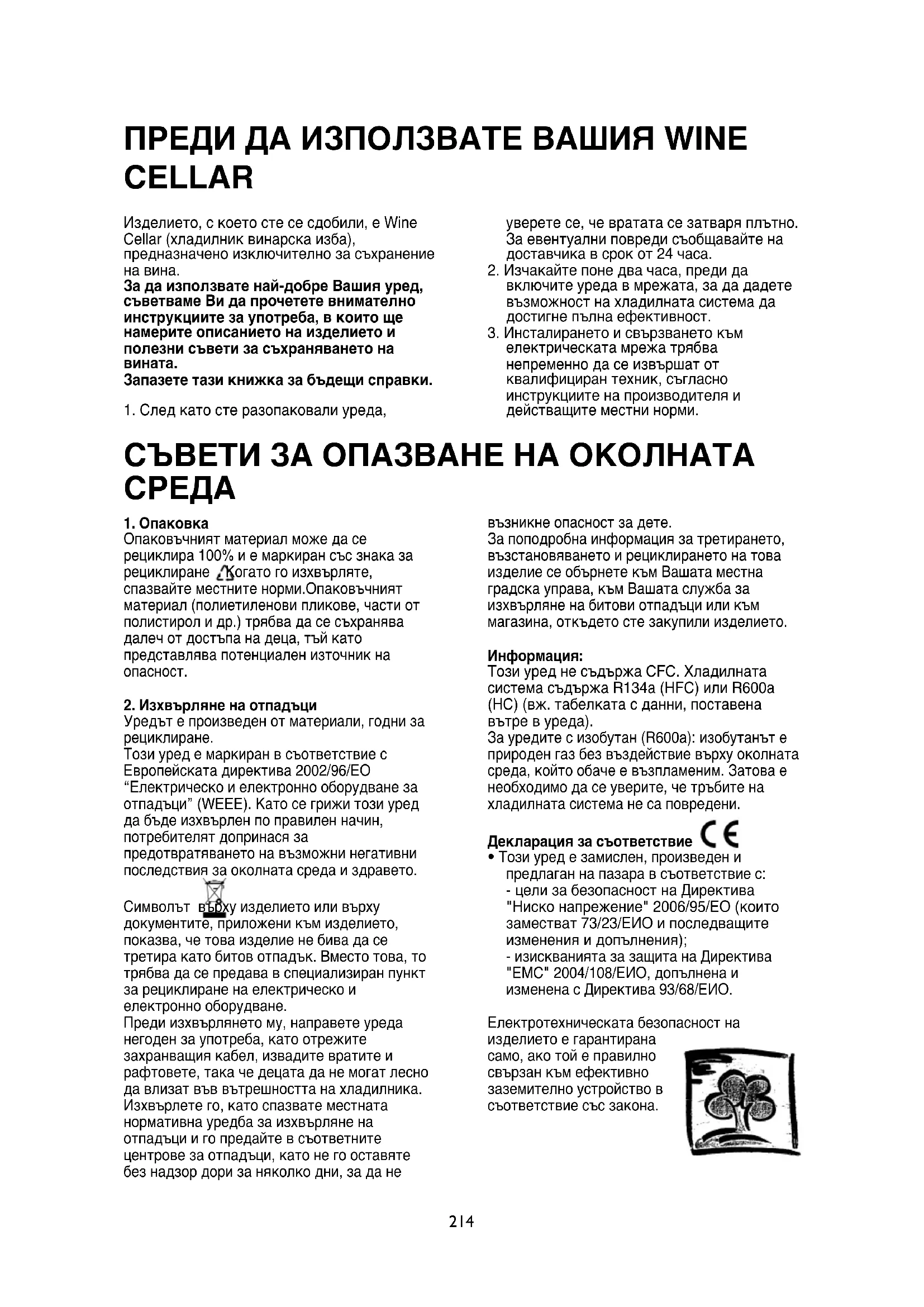 Уредът е произведен от материали, годни за рециклиране. Този уред е маркиран в съответствие с Европейската директива 2002/96/ЕО “Електрическо и електронно оборудване за отпадъци” (WEEE). Като се грижи този уред да бъде изхвърлен по правилен начин, потребителят допринася за предотвратяването на възможни негативни последствия за околната среда и здравето. Символът върху изделието или върху документите, приложени към изделието, показва, че това изделие не бива да се третира като битов отпадък. Вместо това, то трябва да се предава в специализиран пункт за рециклиране на електрическо и електронно оборудване. Преди изхвърлянето му, направете уреда негоден за употреба, като отрежите захранващия кабел, извадите вратите и рафтовете, така че децата да не могат лесно да влизат във вътрешността на хладилника. Изхвърлете го, като спазвате местната нормативна уредба за изхвърляне на отпадъци и го предайте в съответните центрове за отпадъци, като не го оставяте без надзор дори за няколко дни, за да не възникне опасност за дете. За поподробна информация за третирането, възстановяването и рециклирането на това изделие се обърнете към Вашата местна градска управа, към Вашата служба за изхвърляне на битови отпадъци или към магазина, откъдето сте закупили изделието. Информация: Този уред не съдържа CFC. Хладилната система съдържа R134a (HFC) или R600a (HC) (вж. табелката с данни, поставена вътре в уреда). За уредите с изобутан (R600a): изобутанът е природен газ без въздействие върху околната среда, който обаче е възпламеним. Затова е необходимо да се уверите, че тръбите на хладилната система не са повредени. Декларация за съответствие