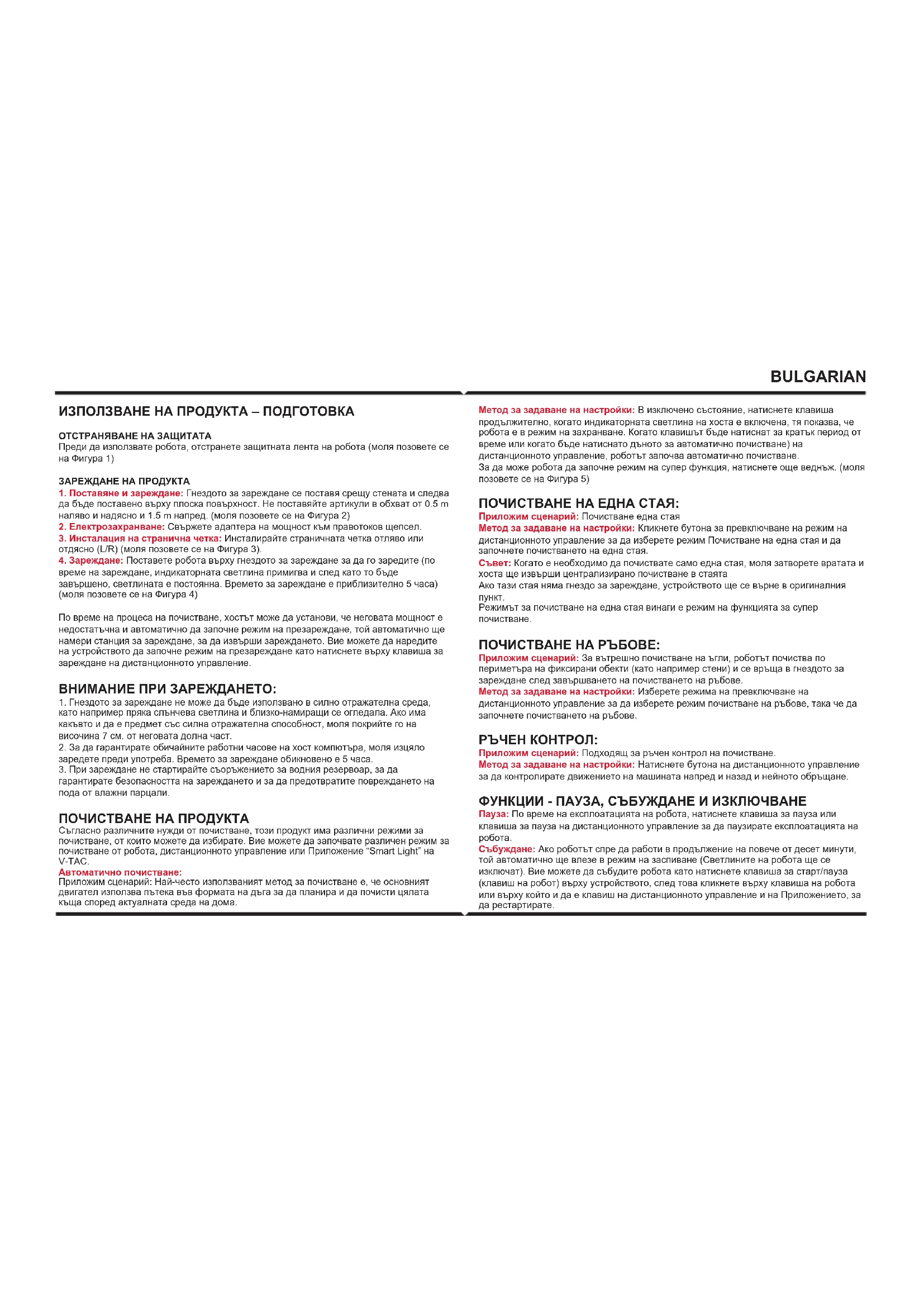 Режимът за почистване на една стая винаги е режим на функцията за супер почистване. ПОЧИСТВАНЕ НА РЪБОВЕ: Приложим сценарий: За вътрешно почистване на ъгли, роботът почиства по периметъра на фиксирани обекти (като например стени) и се връща в гнездото за зареждане след завършването на почистването на ръбове. Метод за задаване на настройки: Изберете режима на превключване на дистанционното управление за да изберете режим почистване на ръбове, така че да започнете почистването на ръбове. РЪЧЕН КОНТРОЛ: Приложим сценарий: Подходящ за ръчен контрол на почистване. Метод за задаване на настройки: Натиснете бутона на дистанционното управление за да контролирате движението на машината напред и назад и нейното обръщане. ФУНКЦИИ - ПАУЗА, СЪБУЖДАНЕ И ИЗКЛЮЧВАНЕ Пауза: По време на експлоатацията на робота, натиснете клавиша за пауза или клавиша за пауза на дистанционното управление за да паузирате експлоатацията на