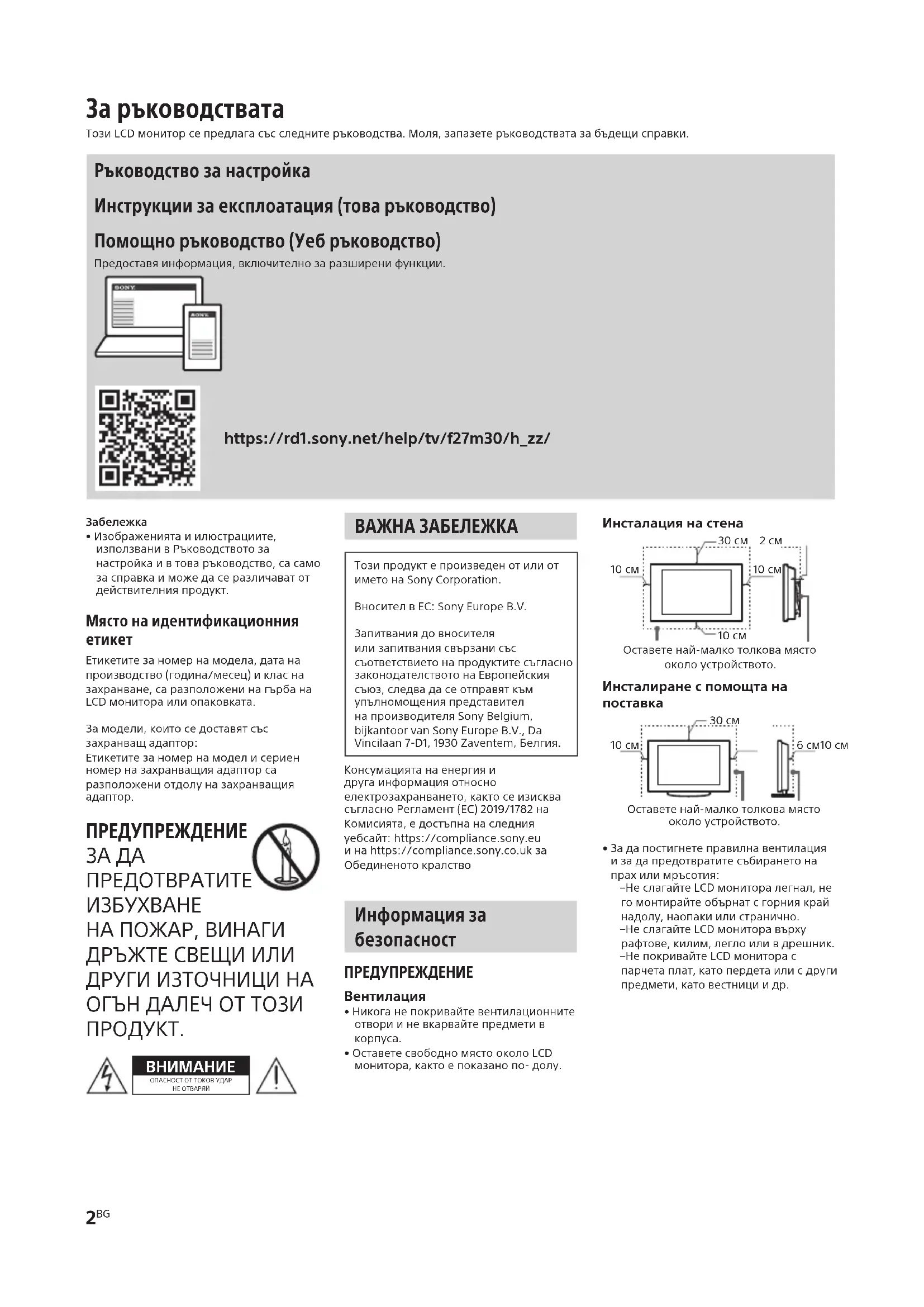 ВНИМАНИЕОПАСНОСТОТТОКОВУДАРНЕОТВАРЯЙ ВАЖНА ЗАБЕЛЕЖКА ТозипродуктепроизведенотилиотиметонаSonyCorporation.ВносителвЕС:SonyEuropeB.V.ЗапитваниядовносителяилизапитваниясвързанисъссъответствиетонапродуктитесъгласнозаконодателствотонаЕвропейскиясъюз,следвадасеотправяткъмупълномощенияпредставителнапроизводителяSonyBelgium,bijkantoorvanSonyEuropeB.V.,DaVincilaan7-D1,1930Zaventem,Белгия.Консумациятанаенергияидругаинформацияотносноелектрозахранването,кактосеизисквасъгласноРегламент(ЕС)2019/1782наКомисията,едостъпнанаследнияуебсайт:https://compliance.sony.euинаhttps://compliance.sony.co.ukзаОбединенотокралство Информация за безопасност ПРЕДУПРЕЖДЕНИЕ Вентилация•Никоганепокривайтевентилационнитеотворииневкарвайтепредметивкорпуса.•ОставетесвободномястооколоLCDмонитора,кактоепоказанопо-долу.Инсталация на стенаОставетенай-малкотолковамястооколоустройството.10cм30cм 2cм10cм10cмИнсталиране с помощта на поставкаОставетенай-малкотолковамястооколоустройството.6cм10cм30cм10cм•Задапостигнетеправилнавентилацияизадапредотвратитесъбиранетонапрахилимръсотия:– НеслагайтеLCDмониторалегнал,негомонтирайтеобърнатсгорниякрайнадолу,наопакиилистранично.– НеслагайтеLCDмониторавърхурафтове,килим,леглоиливдрешник.– НепокривайтеLCDмонитораспарчетаплат,катопердетаилисдругипредмети,катовестнициидр. За ръководствата ТозиLCDмониторсепредлагасъсследнитеръководства.Моля,запазетеръководстватазабъдещисправки. Ръководство за настройка Инструкции за експлоатация (това ръководство) Помощно ръководство (Уеб ръководство) Предоставяинформация,включителнозаразширенифункции.https://rd1.sony.net/help/tv/f27m30/h_zz/SDM-F27M30 5-047-045-31(1)