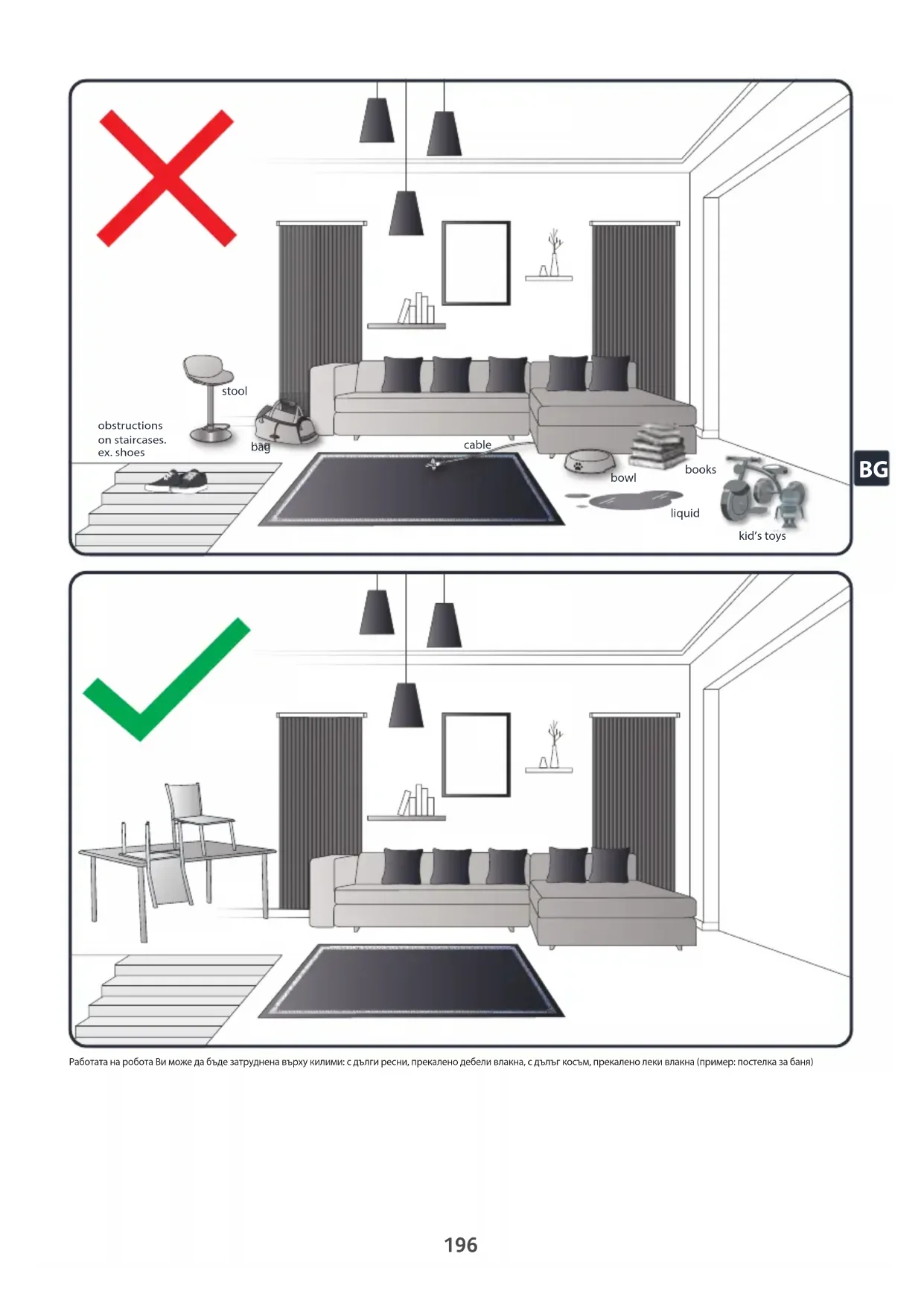Работата на робота Ви може да бъде затруднена върху килими: с дълги ресни, прекалено дебели влакна, с дълъг косъм, прекалено леки влакна (пример: постелка за баня) stool books bowl liquid bag bag bag