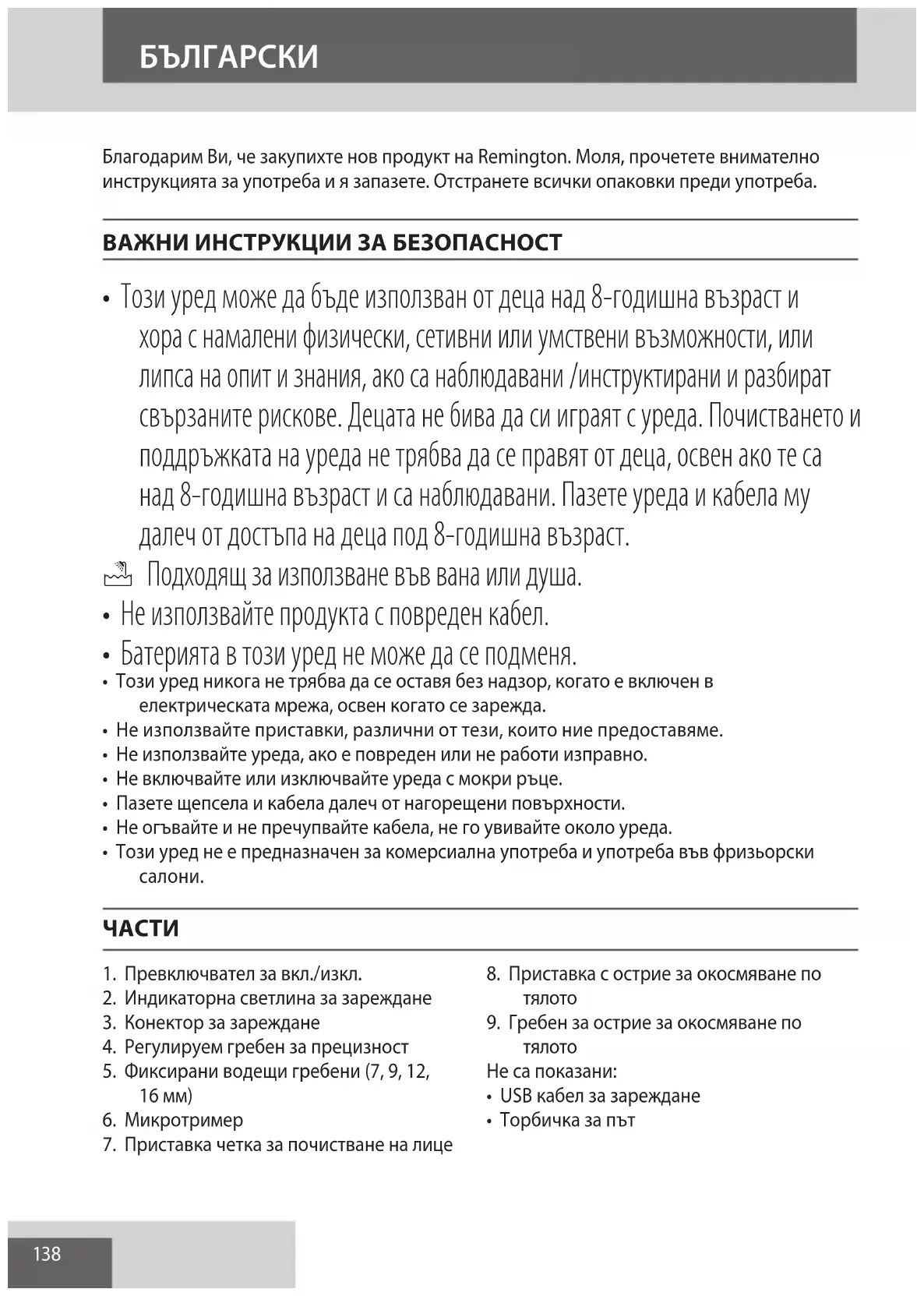 AE138 Благодарим Ви, че закупихте нов продукт на Remington. Моля, прочетете внимателно инструкцията за употреба и я запазете. Отстранете всички опаковки преди употреба. ВАЖНИ ИНСТРУКЦИИ ЗА БЕЗОПАСНОСТ