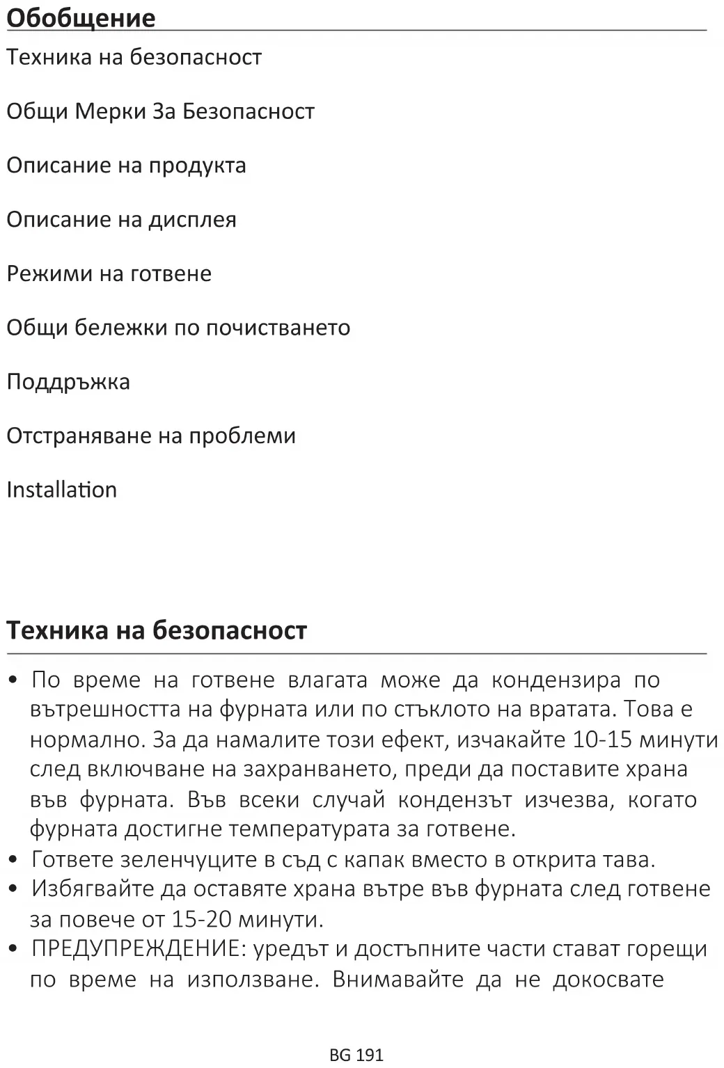 - По време на готвене влагата може да кондензира по вътрешността на фурната или по стъклото на вратата. Това е нормално. За да намалите този ефект, изчакайте 10-15 минути след включване на захранването, преди да поставите храна във фурната. Във всеки случай кондензът изчезва, когато фурната достигне температурата за готвене.