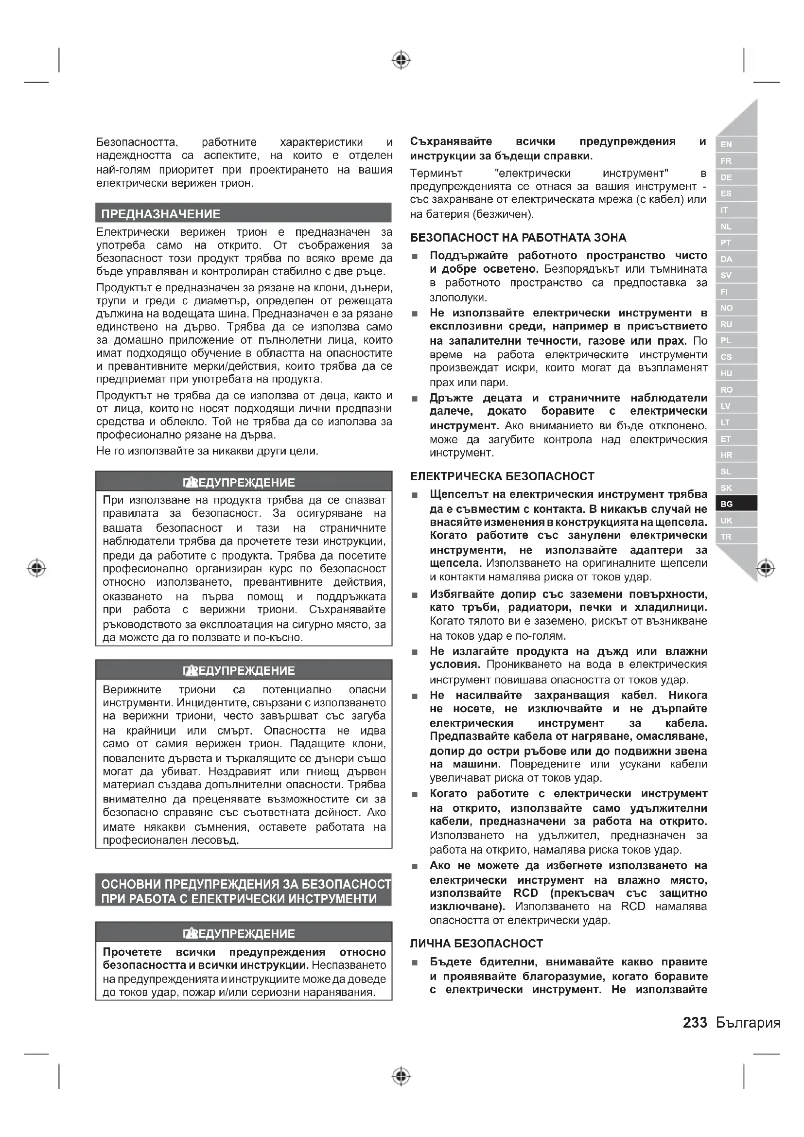 Безопасността, работните характеристики и надеждността са аспектите, на които е отделен най-голям приоритет при проектирането на вашия електрически верижен трион. ПРЕДНАЗНАЧЕНИЕ Електрически верижен трион е предназначен за употреба само на открито. От съображения за безопасност този продукт трябва по всяко време да бъде управляван и контролиран стабилно с две ръце. Продуктът е предназначен за рязане на клони, дънери, трупи и греди с диаметър, определен от режещата дължина на водещата шина. Предназначен е