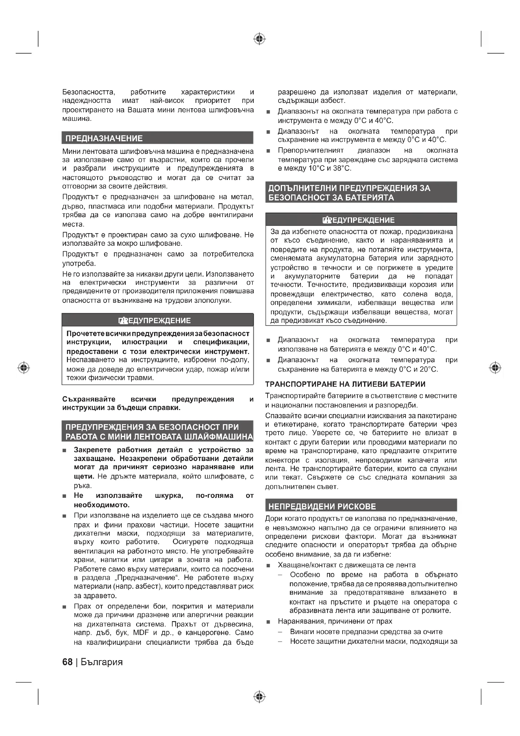 ■ Не използвайте шкурка, по-голяма от необходимото. ■ При използване на изделието ще се създава много прах и фини прахови частици. Носете защитни дихателни маски, подходящи за материалите, върху които работите. Осигурете подходяща вентилация на работното място. Не употребявайте храни, напитки или цигари в зоната на работа. Работете само върху материали, които са посочени в раздела „Предназначение“. Не работете върху материали (напр. азбест), които представляват риск за здравето. ■ Прах от определени бои, покрития и материали може да причини дразнене или алергични реакции на дихателната система. Прахът от дървесина, напр. дъб, бук, MDF и др., е канцерогене. Само на квалифицирани специалисти трябва да бъде разрешено да използват изделия от материали, съдържащи азбест. ■ Диапазонът на околната температура при работа с инструмента е между 0°C и 40°C. ■ Диапазонът на околната температура при съхранение на инструмента е между 0°C и 40°C. ■ Препоръчителният диапазон на околната температура при зареждане със зарядната система е между 10°C и 38°C. ДОПЪЛНИТЕЛНИ ПРЕДУПРЕЖДЕНИЯ ЗА БЕЗОПАСНОСТ ЗА БАТЕРИЯТА ПРЕДУПРЕЖДЕНИЕ За да избегнете опасността от пожар, предизвикана от късо съединение, както и нараняванията и повредите на продукта, не потапяйте инструмента, сменяемата акумулаторна батерия или зарядното устройство в течности и се погрижете в уредите и акумулаторните батерии да не попадат течности. Течностите, предизвикващи корозия или провеждащи електричество, като солена вода, определени химикали, избелващи вещества или продукти, съдържащи избелващи вещества, могат да предизвикат късо съединение. ■ Диапазонът на околната температура при използване на батерията е между 0°C и 40°C. ■ Диапазонът на околната температура при съхранение на батерията е между 0°C и 20°C. ТРАНСПОРТИРАНЕ НА ЛИТИЕВИ БАТЕРИИ Транспортирайте батериите в съответствие с местните и национални постановления и разпоредби. Спазвайте всички специални изисквания за пакетиране и етикетиране, когато транспортирате батерии чрез трето лице. Уверете се, че батериите не влизат в контакт с други батерии или проводими материали по време на транспортиране, като предпазите откритите конектори с изолация, непроводими капачета или лента. Не транспортирайте батерии, които са спукани или текат. Свържете се със следната компания за допълнителен съвет. НЕПРЕДВИДЕНИ РИСКОВЕ Дори когато продуктът се използва по предназначение, е невъзможно напълно да се ограничи влиянието на определени рискови фактори. Могат да възникнат следните опасности и операторът трябва да обърне особено внимание, за да ги избегне: ■ Хващане/контакт с движещата се лента – Особено по време на работа в обърнато положение, трябва да се проявява допълнително внимание за предотвратяване влизането в контакт на пръстите и ръцете на оператора с абразивната лента или защипване от ролките. ■ Наранявания, причинени от прах – Винаги носете предпазни средства за очите – Носете защитни дихателни маски, подходящи за69 България |