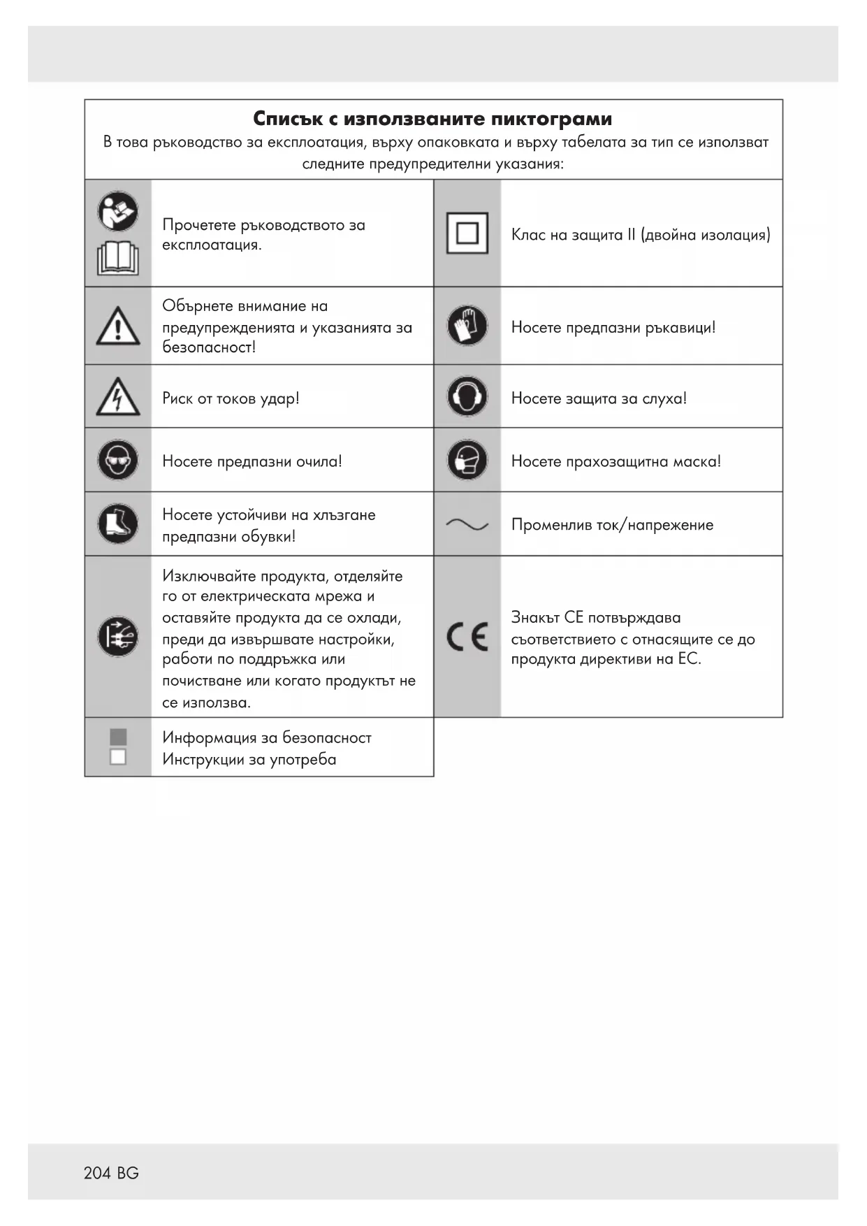 Списък с използваните пиктограми В това ръководство за експлоатация, върху опаковката и върху табелата за тип се използват следните предупредителни указания: Прочетете ръководството за експлоатация. Клас на защитаII (двойна изолация) Обърнете внимание на предупрежденията и указанията за безопасност! Носете предпазни ръкавици! Риск от токов удар!