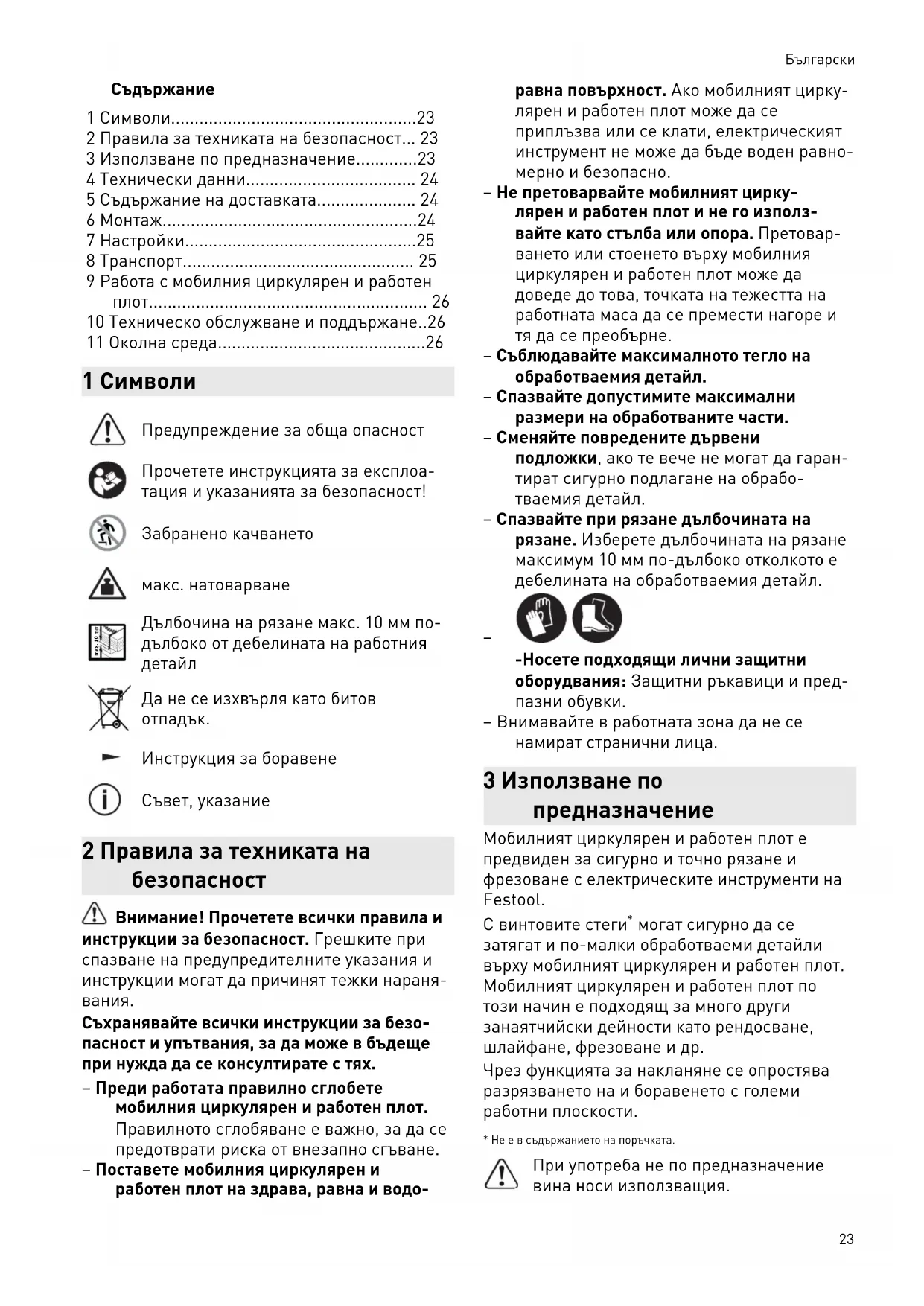-Носете подходящи лични защитни оборудвания: Защитни ръкавици и пред пазни обувки. – Внимавайте в работната зона да не се намират странични лица. 3 Използване по предназначение Мобилният циркулярен и работен плот е предвиден за сигурно и точно рязане и фрезоване с електрическите инструменти на Festool. С винтовите стеги