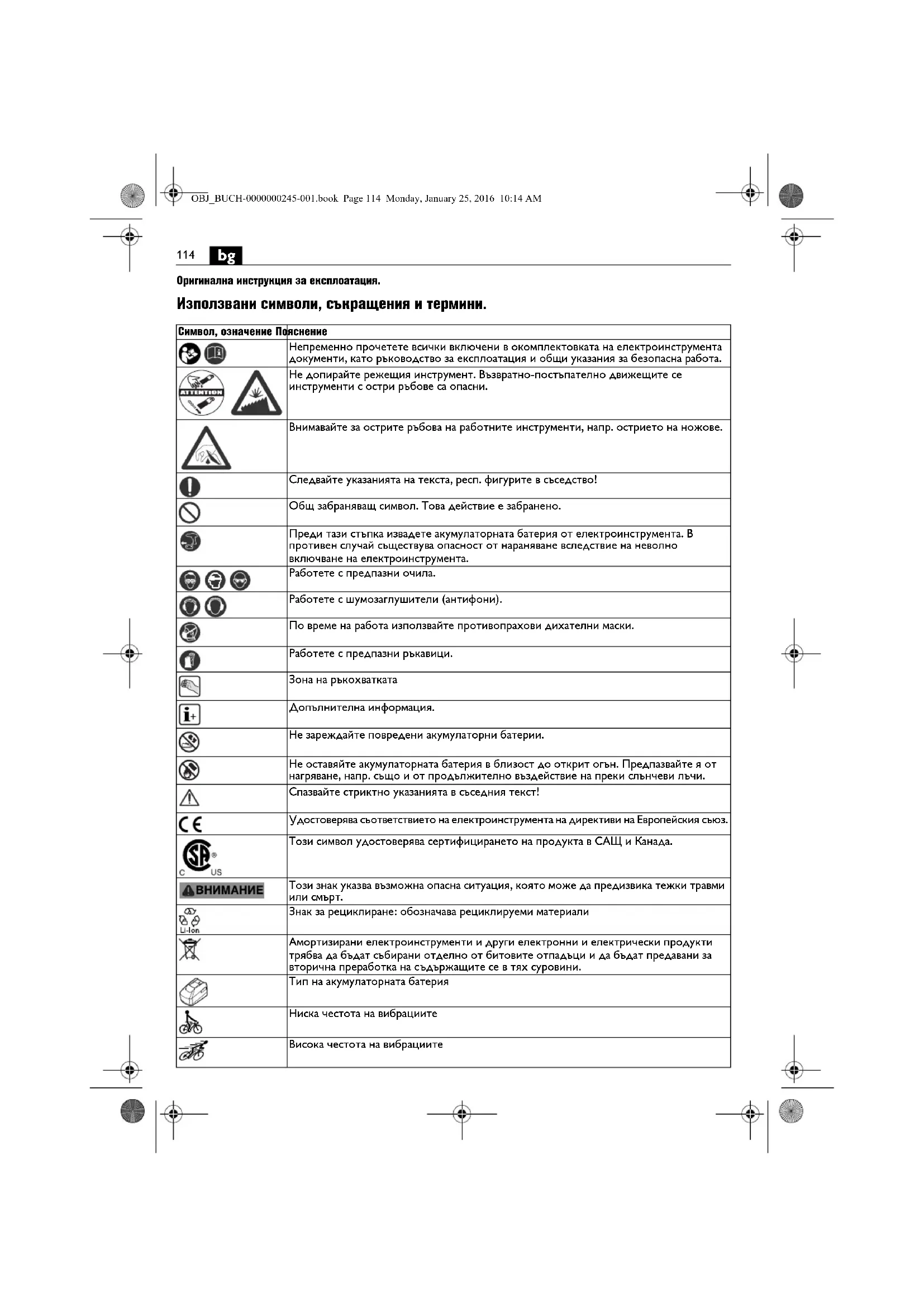 Оригинална инструкция за експлоатация. Използвани символи, съкращения и термини. Символ, означение Пояснение Непременно прочетете всички включени в окомплектовката на електроинструмента документи, като ръководство за експлоатация и общи указания за безопасна работа. Не допирайте режещия инструмент. Възвратно-постъпателно движещите се инструменти с остри ръбове са опасни. Внимавайте за острите ръбова на работните инструменти, напр. острието на ножове. Следвайте указанията на текста, респ. фигурите в съседство! Общ забраняващ символ. Това действие е забранено. Преди тази стъпка извадете акумулаторната батерия от електроинструмента. В противен случай съществува опасност от нараняване вследствие на неволно включване на електроинструмента. Работете с предпазни очила. Работете с шумозаглушители (антифони). По време на работа използвайте противопрахови дихателни маски. Работете с предпазни ръкавици. Зона на ръкохватката Допълнителна информация. Не зареждайте повредени акумулаторни батерии. Не оставяйте акумулаторната батерия в близост до открит огън. Предпазвайте я от нагряване, напр. също и от продължително въздействие на преки слънчеви лъчи. Спазвайте стриктно указанията в съседния текст! Удостоверява съответствието на електроинструмента на директиви на Европейския съюз. Този символ удостоверява сертифицирането на продукта в САЩ и Канада. Този знак указва възможна опасна ситуация, която може да предизвика тежки травми