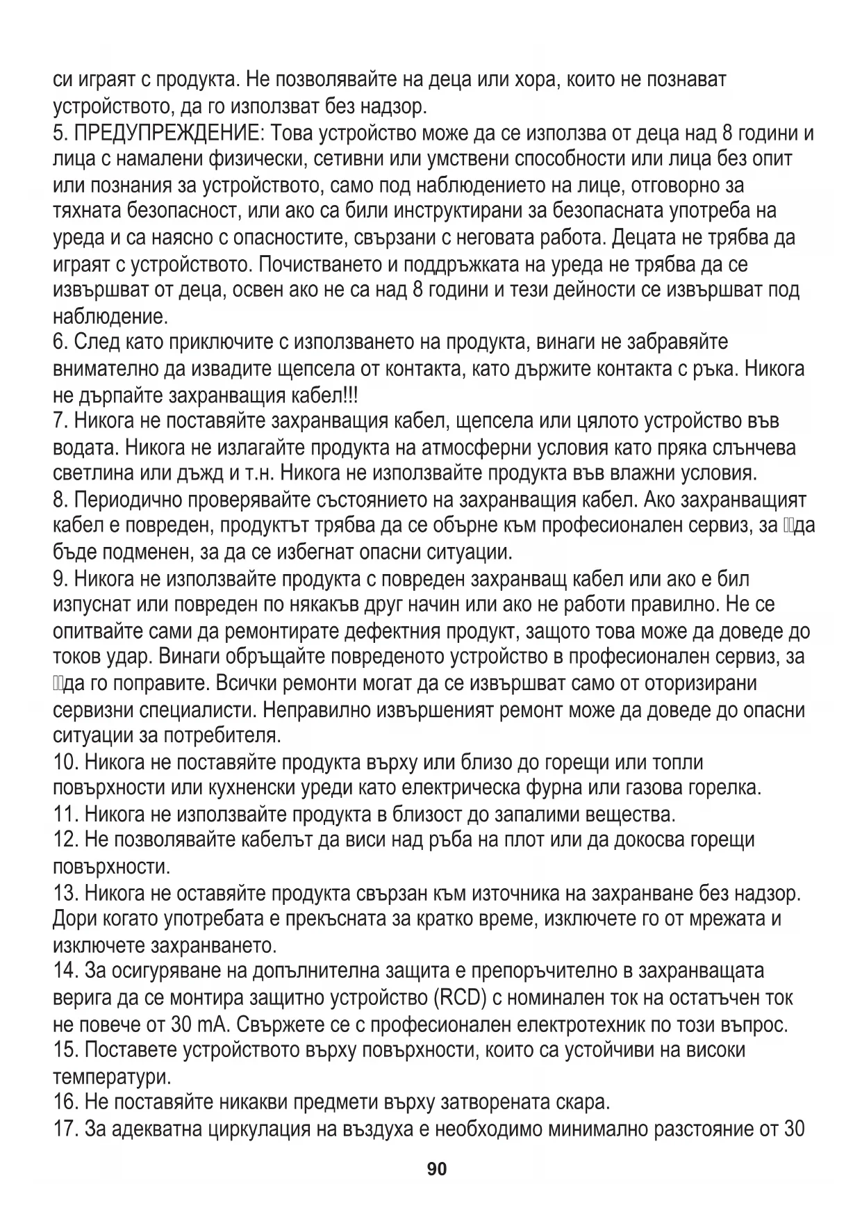 лица с намалени физически, сетивни или умствени способности или лица без опит или познания за устройството, само под наблюдението на лице, отговорно за тяхната безопасност, или ако са били инструктирани за безопасната употреба на уреда и са наясно с опасностите, свързани с неговата работа. Децата не трябва да играят с устройството. Почистването и поддръжката на уреда не трябва да се извършват от деца, освен ако не са над 8 години и тези дейности се извършват под наблюдение.