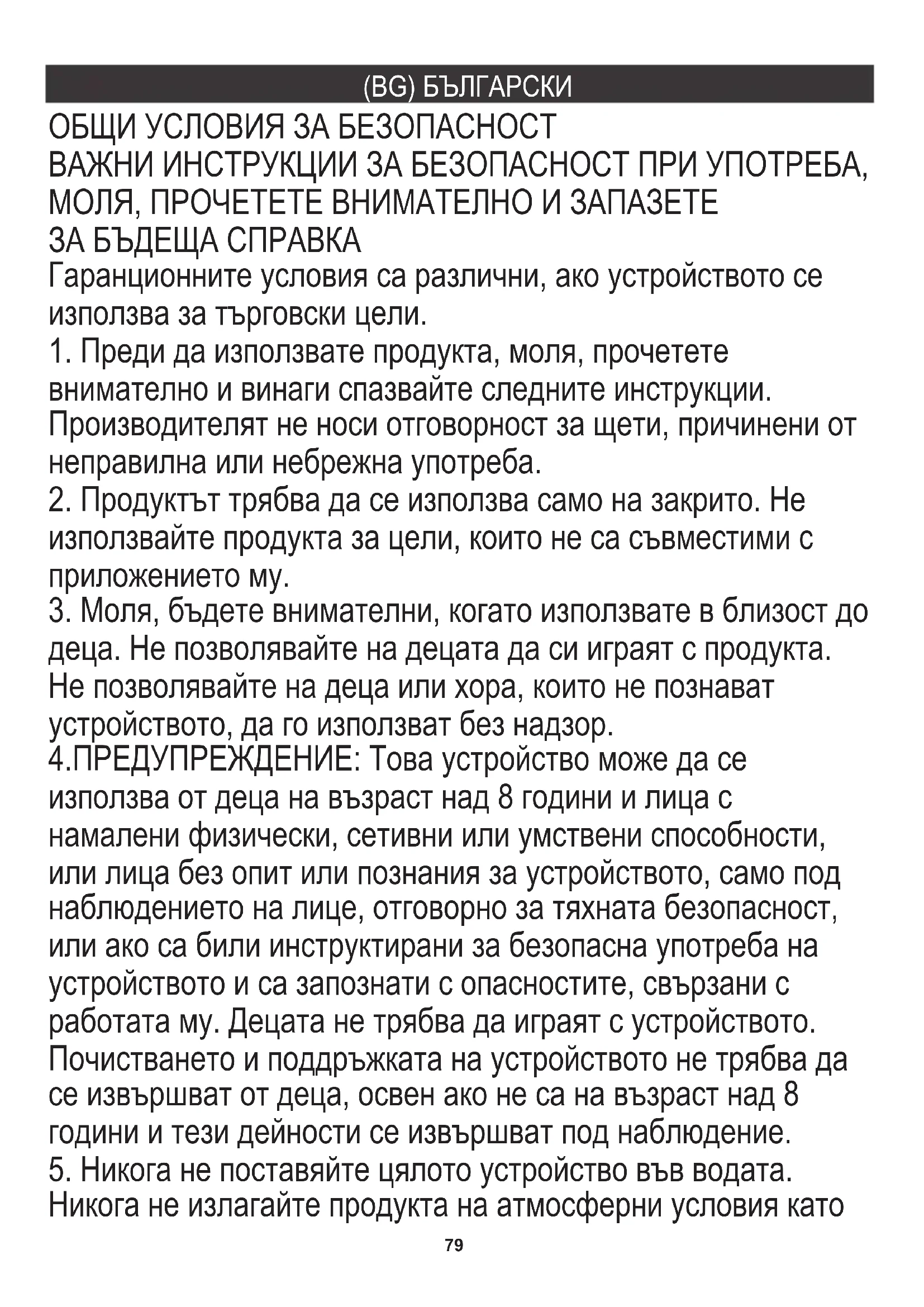 деца. Не позволявайте на децата да си играят с продукта. Не позволявайте на деца или хора, които не познават устройството, да го използват без надзор. Гаранционните условия са различни, ако устройството се използва за търговски цели. ОБЩИ УСЛОВИЯ ЗА БЕЗОПАСНОСТ Производителят не носи отговорност за щети, причинени от неправилна или небрежна употреба.80 пряка слънчева светлина или дъжд и др. Никога не използвайте продукта във влажни условия.