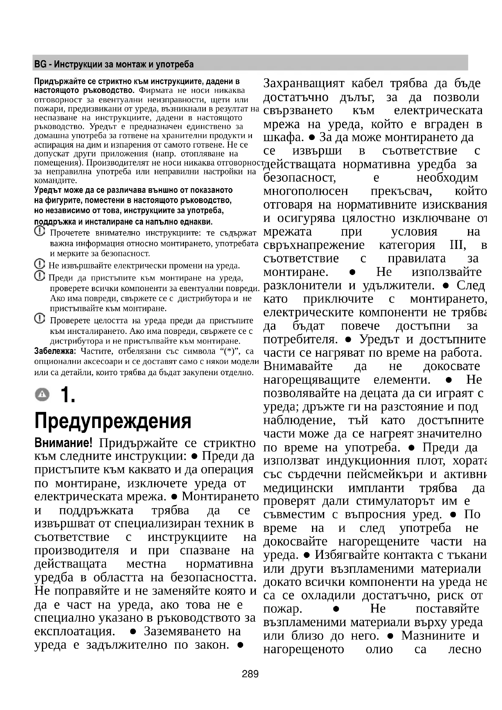 Ha a fenti ellenőrzés után a hibajelzés továbbra is fennmarad, vegye fel a kapcsolatot a legközelebbi műszaki szervizzel.289 BG - Инструкции за монтаж и употреба Придържайте се стриктно към инструкциите, дадени в настоящото ръководство. Фирмата не носи никаква отговорност за евентуални неизправности, щети или пожари, предизвикани от уреда, възникнали в резултат на неспазване на инструкциите, дадени в настоящото ръководство. Уредът е предназначен единствено за домашна употреба за готвене на хранителни продукти и аспирация на дим и изпарения от самото готвене. Не се допускат други приложения (напр. отопляване на помещения). Производителят не носи никаква отговорност за неправилна употреба или неправилни настройки на