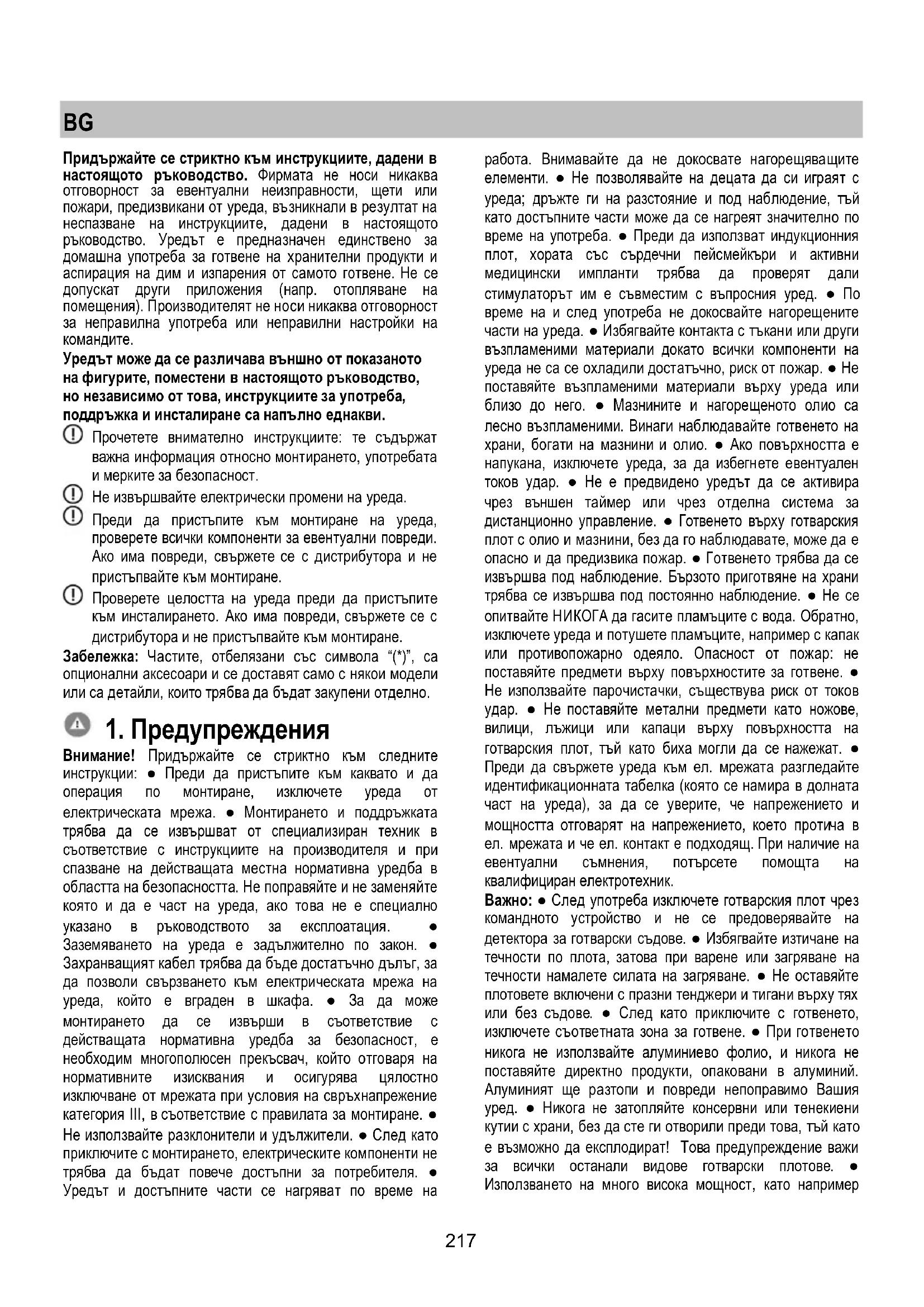 Внимание! Придържайте се стриктно към следните инструкции: ● Преди да пристъпите към каквато и да операция по монтиране, изключете уреда от електрическата мрежа. ● Монтирането и поддръжката трябва да се извършват от специализиран техник в съответствие с инструкциите на производителя и при спазване на действащата местна нормативна уредба в областта на безопасността. Не поправяйте и не заменяйте която и да е част на уреда, ако това не е специално указано в ръководството за експлоатация. ● Заземяването на уреда е задължително по закон. ● Захранващият кабел трябва да бъде достатъчно дълъг, за да позволи свързването към електрическата мрежа на уреда, който е вграден в шкафа. ● За да може монтирането да се извърши в съответствие с действащата нормативна уредба за безопасност, е необходим многополюсен прекъсвач, който отговаря на нормативните изисквания и осигурява цялостно изключване от мрежата при условия на свръхнапрежение категория III, в съответствие с правилата за монтиране. ● Не използвайте разклонители и удължители. ● След като приключите с монтирането, електрическите компоненти не трябва да бъдат повече достъпни за потребителя. ● Уредът и достъпните части се нагряват по време на работа. Внимавайте да не докосвате нагорещяващите елементи. ● Не позволявайте на децата да си играят с уреда; дръжте ги на разстояние и под наблюдение, тъй като достъпните части може да се нагреят значително по време на употреба. ● Преди да използват индукционния плот, хората със сърдечни пейсмейкъри и активни медицински импланти трябва да проверят дали стимулаторът им е съвместим с въпросния уред. ● По време на и след употреба не докосвайте нагорещените части на уреда. ● Избягвайте контакта с тъкани или други възпламеними материали докато всички компоненти на уреда не са се охладили достатъчно, риск от пожар. ● Не поставяйте възпламеними материали върху уреда или близо до него. ● Мазнините и нагорещеното олио са лесно възпламеними. Винаги наблюдавайте готвенето на храни, богати на мазнини и олио. ● Ако повърхността е напукана, изключете уреда, за да избегнете евентуален токов удар. ● Не е предвидено уредът да се активира чрез външен таймер или чрез отделна система за дистанционно управление. ● Готвенето върху готварския плот с олио и мазнини, без да го наблюдавате, може да е опасно и да предизвика пожар. ● Готвенето трябва да се извършва под наблюдение. Бързото приготвяне на храни трябва се извършва под постоянно наблюдение. ● Не се опитвайте НИКОГА да гасите пламъците с вода. Обратно, изключете уреда и потушете пламъците, например с капак или противопожарно одеяло. Опасност от пожар: не поставяйте предмети върху повърхностите за готвене. ● Не използвайте парочистачки, съществува риск от токов удар. ● Не поставяйте метални предмети като ножове, вилици, лъжици или капаци върху повърхността на готварския плот, тъй като биха могли да се нажежат. ● Преди да свържете уреда към ел. мрежата разгледайте идентификационната табелка (която се намира в долната част на уреда), за да се уверите, че напрежението и мощността отговарят на напрежението, което протича в ел. мрежата и че ел. контакт е подходящ. При наличие на евентуални съмнения, потърсете помощта на квалифициран електротехник. Важно: ● След употреба изключете готварския плот чрез команд