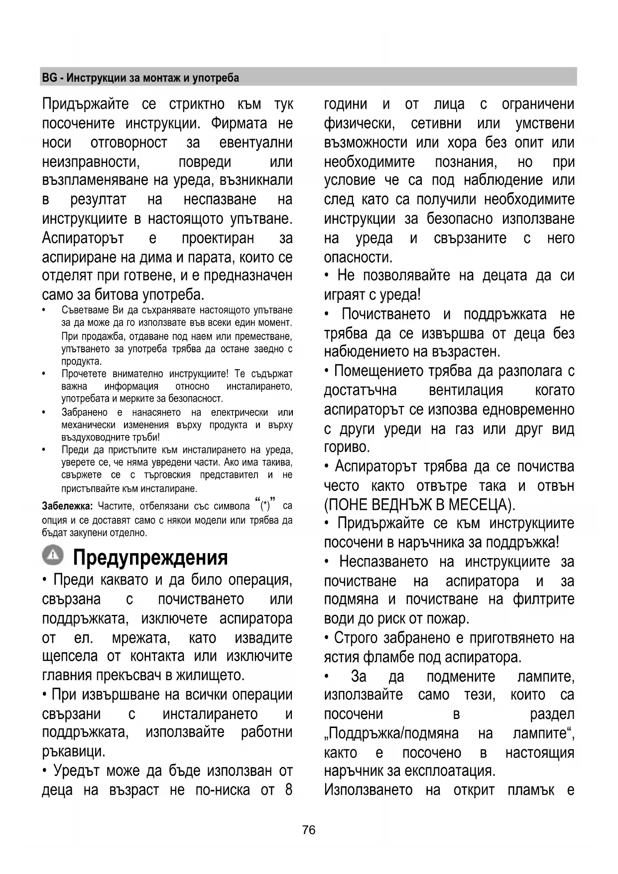Szerelje vissza a rostélyt. Amennyiben a világítás nem működik, mielőtt a műszaki szervizszolgálatot hívná ,ellenőrizze, hogy az égők helyesen illeszkednek-e a foglalatba.76 BG - Инструкции за монтаж и употреба Придържайте се стриктно към тук посочените инструкции. Фирмата не носи отговорност за евентуални неизправности, повреди или възпламеняване на уреда, възникнали в резултат на неспазване на инструкциите в настоящото упътване. Аспираторът е проектиран за аспириране на дима и парата, които се отделят при готвене, и е предназначен само за битова употреба.