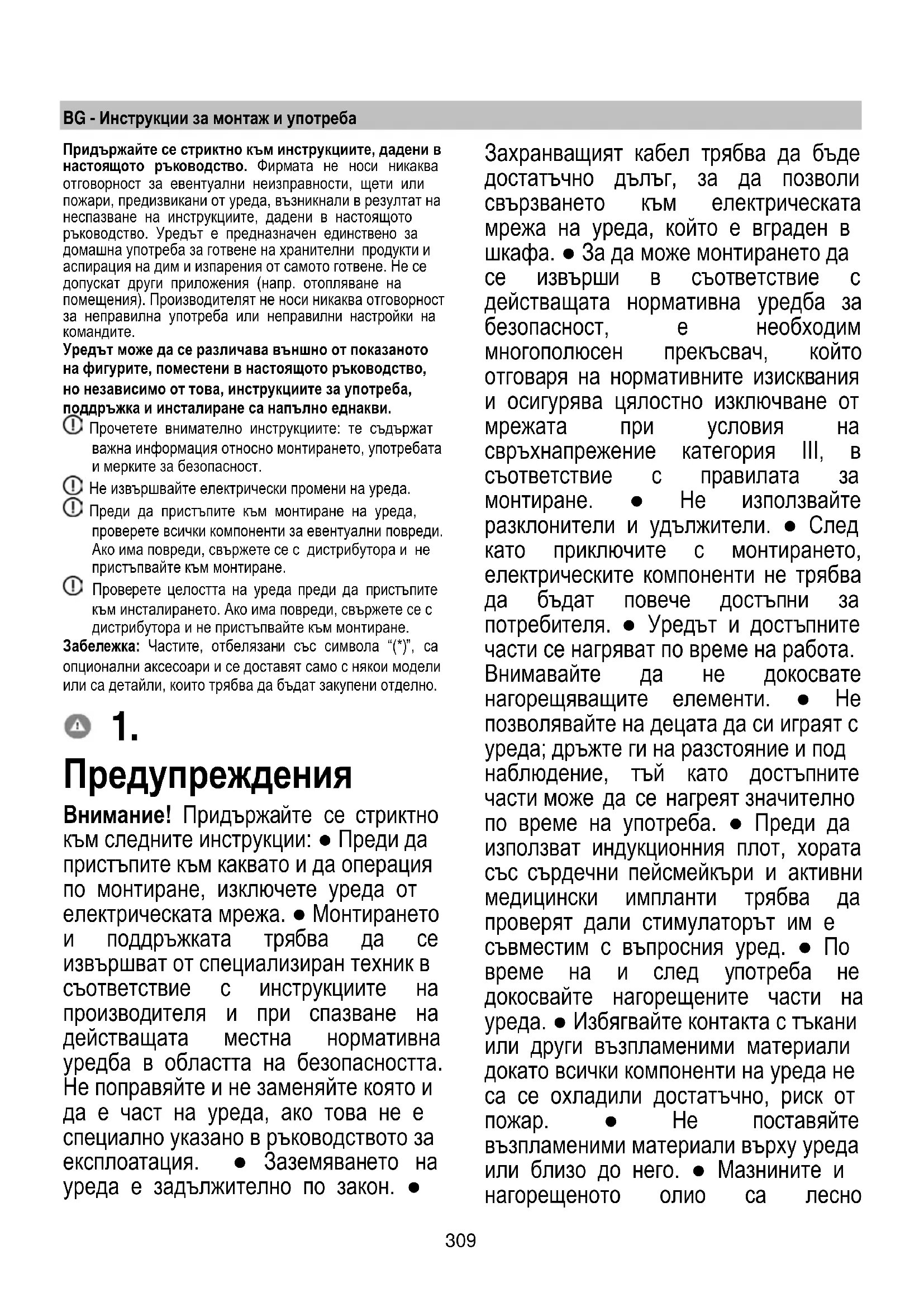 Ha a fenti ellenőrzés után a hibajelzés továbbra is fennmarad, vegye fel a kapcsolatot a legközelebbi műszaki szervizzel.309 BG - Инструкции за монтаж и употреба Придържайте се стриктно към инструкциите, дадени в настоящото ръководство. Фирмата не носи никаква отговорност за евентуални неизправности, щети или пожари, предизвикани от уреда, възникнали в резултат на неспазване на инструкциите, дадени в настоящото ръководство. Уредът е предназначен единствено за домашна употреба за готвене на хранителни продукти и аспирация на дим и изпарения от самото готвене. Не се допускат други приложения (напр. отопляване на помещения). Производителят не носи никаква отговорност за неправилна употреба или неправилни настройки на