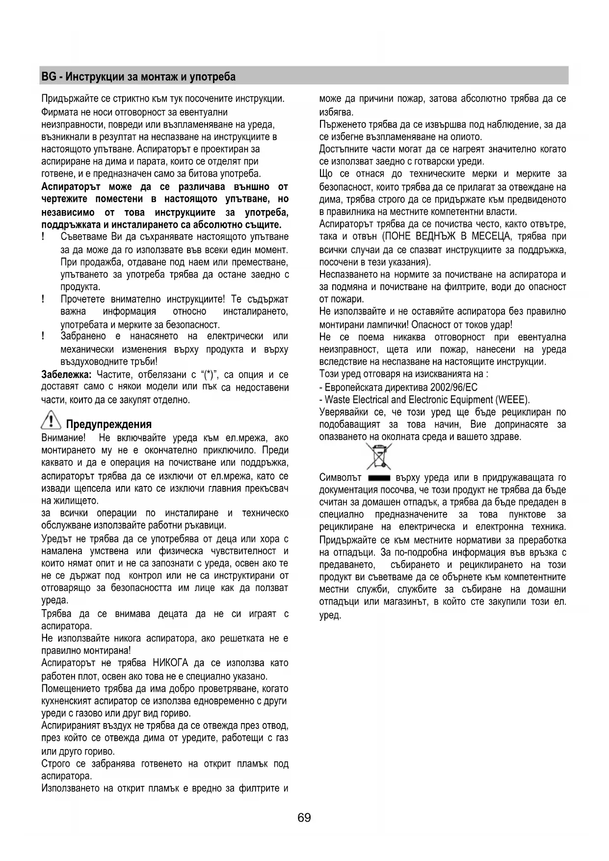 Трябва да се внимава децата да не си играят с аспиратора. Не използвайте никога аспиратора, ако решетката не е правилно монтирана! Аспираторът не трябва НИКОГА да се използва като работен плот, освен ако това не е специално указано. Помещението трябва да има добро проветряване, когато кухненският аспиратор се използва едновременно с други уреди с газово или друг вид гориво. Аспирираният въздух не трябва да се отвежда през отвод, през който се отвежда дима от уредите, работещи с газ или друго гориво. Строго се забранява готвенето на открит пламък под аспиратора. Използването на открит пламък е вредно за филтрите и може да причини пожар, затова абсолютно трябва да се