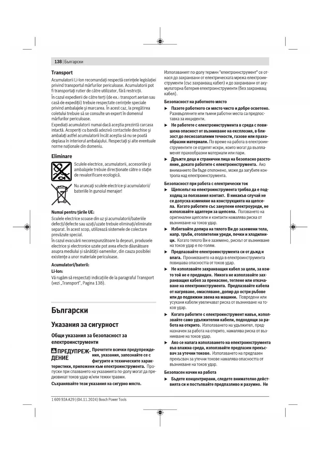 Електроинструментите, акумулаторните ба- терии и допълнителните приспособления трябва да бъдат предавани за оползотворя- ване на съдържащите се в тях суровини. 1 609 92A A29 | (04.11.2024) Bosch Power ToolsМакедонски | 145 Не изхвърляйте електроинструменти и аку- мулаторни или обикновени батерии при би- товите отпадъци! Само за страни отЕС: Негодните за употреба електроинструменти и дефектните или изразходвани акумулаторни/обикновени батерии трябва да се изхвърлят разделно. Използвайте предвиде- ните системи за събиране. При неправилно изхвърляне излезли от употреба елект- рически и електронни уреди могат да имат вредни ефек- ти върху околната среда и човешкото здраве поради евентуално наличие на опасни вещества. Акумулаторни или обикновени батерии: Литиево-йонни: Моля, спазвайте указанията в раздела Транспортиране (вж. „Транспортиране“, Страница144).