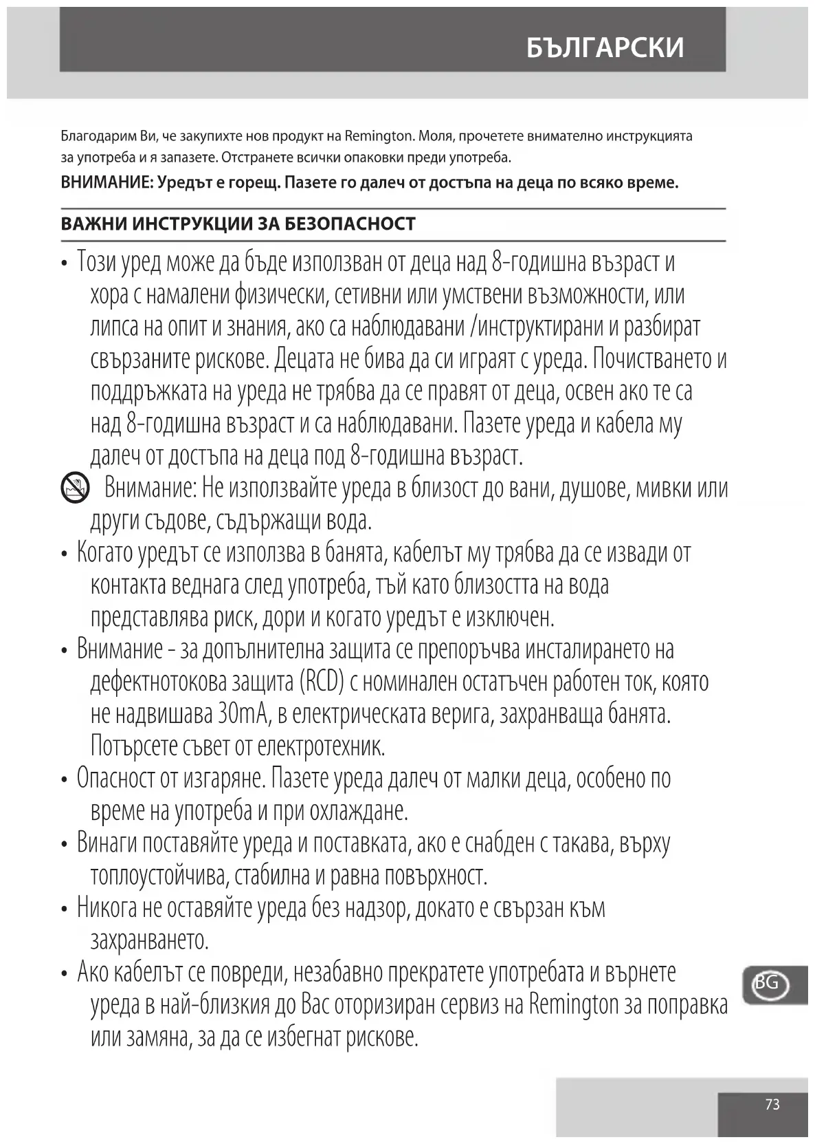 Благодарим Ви, че закупихте нов продукт на Remington. Моля, прочетете внимателно инструкцията за употреба и я запазете. Отстранете всички опаковки преди употреба. ВНИМАНИЕ: Уредът е горещ. Пазете го далеч от достъпа на деца по всяко време. ВАЖНИ ИНСТРУКЦИИ ЗА БЕЗОПАСНОСТ