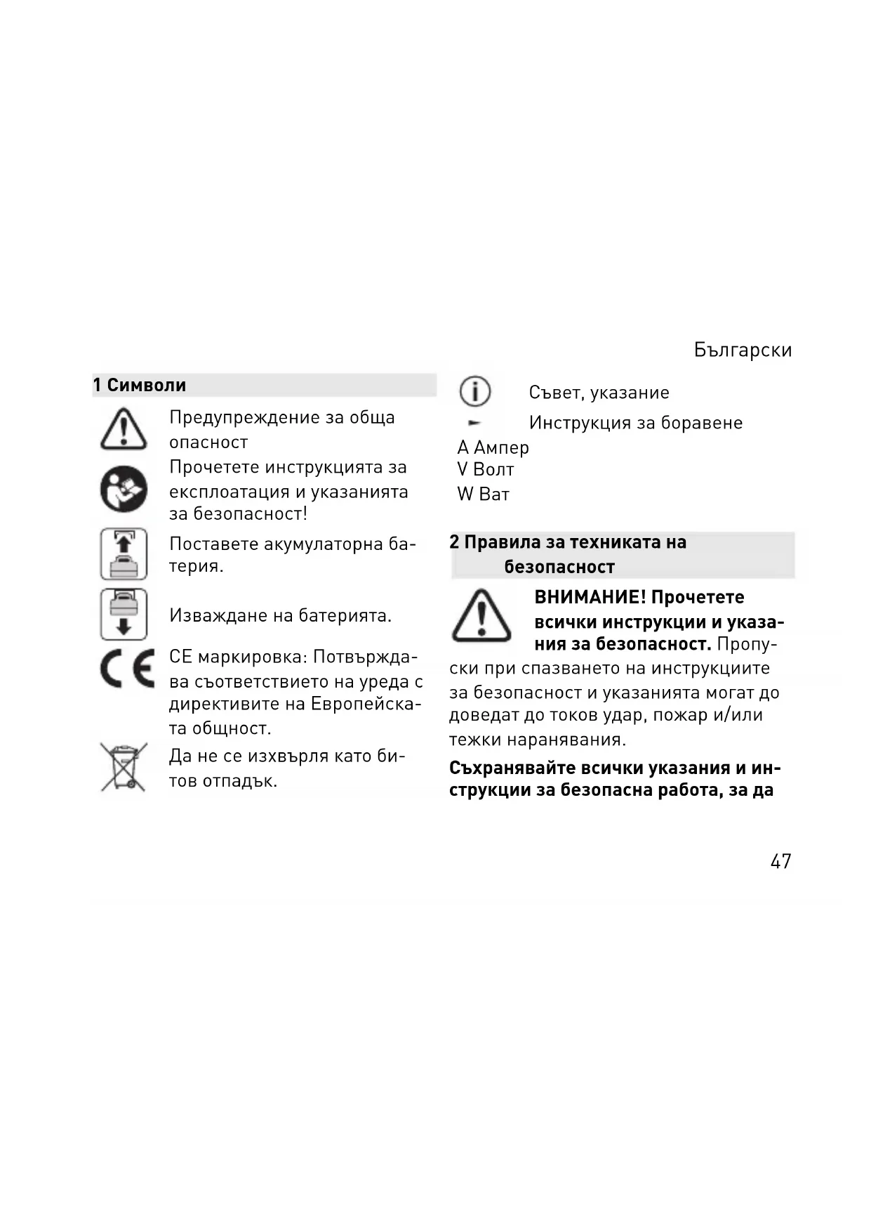 Изваждане на батерията. CE маркировка: Потвържда ва съответствието на уреда с директивите на Европейска та общност. Да не се изхвърля като би тов отпадък. Съвет, указание Инструкция за боравене A Ампер V Волт W Ват 2 Правила за техниката на безопасност ВНИМАНИЕ! Прочетете всички инструкции и указа ния за безопасност. Пропу ски при спазването на инструкциите за безопасност и указанията могат до доведат до токов удар, пожар и/или тежки наранявания. Съхранявайте всички указания и ин струкции за безопасна работа, за да