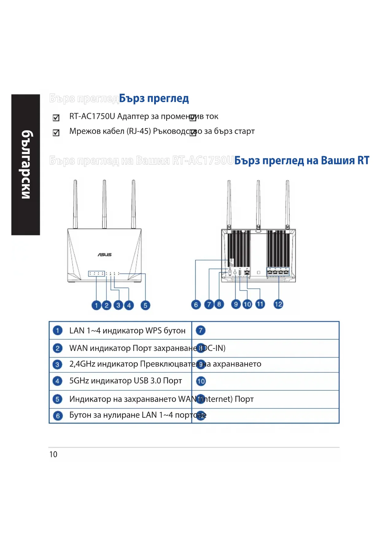 Бърз преглед на Вашия RT-AC1750UБърз преглед на Вашия RT-AC1750U Бърз прегледБърз преглед RT-AC1750U Адаптер за променлив ток Мрежов кабел (RJ-45) Ръководство за бърз старт LAN 1~4 индикатор WPS бутон WAN индикатор Порт захранване (DC-IN) 2,4GHz индикатор Пpeвклюцватeл на ахранването 5GHz индикатор USB 3.0 Порт Индикатор на захранването WAN (Internet) Порт Бутон за нулиране LAN 1~4 портове11