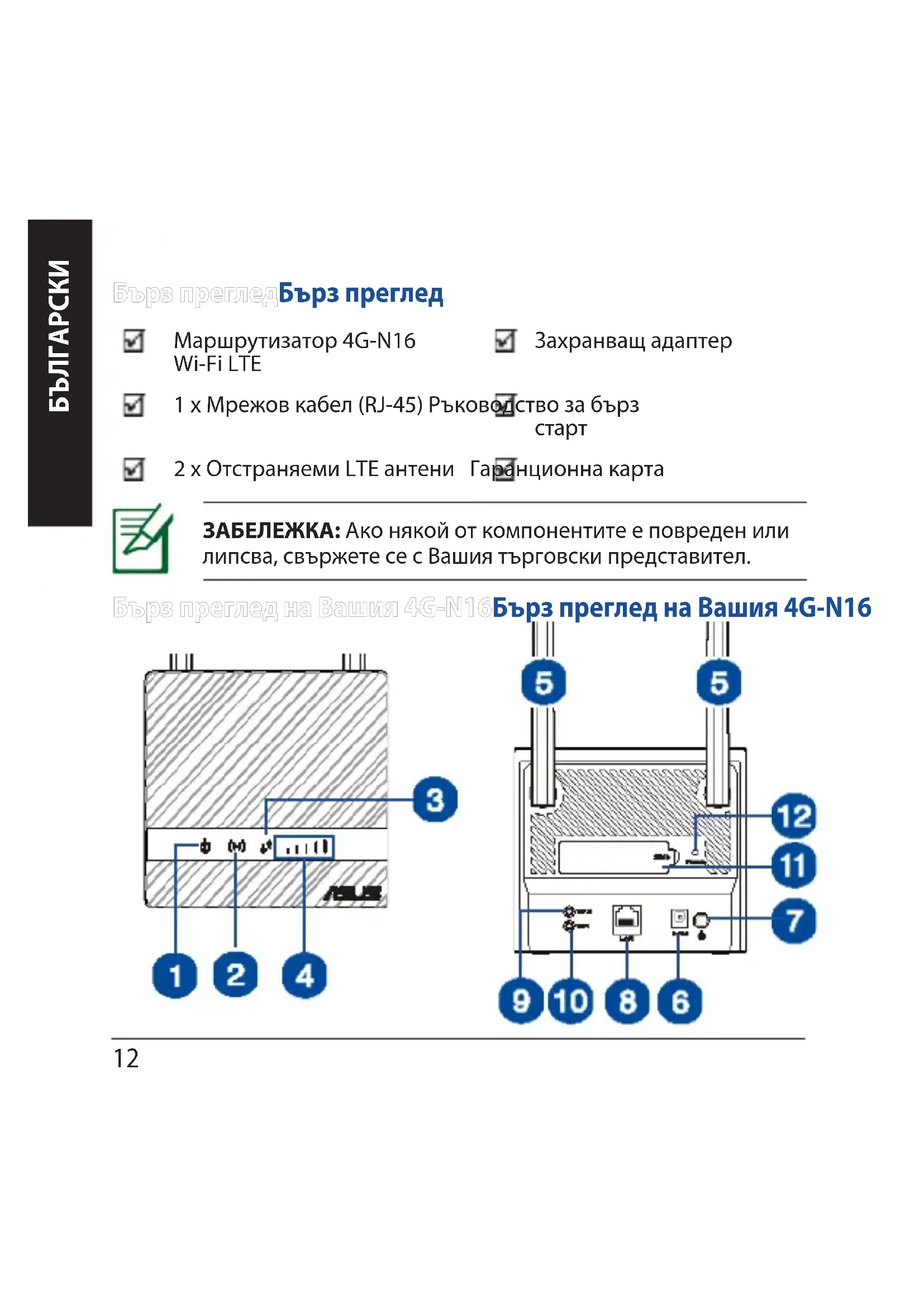 Бърз преглед на Вашия 4G-N16Бърз преглед на Вашия 4G-N16 ЗАБЕЛЕЖКА: Ако някой от компонентите е повреден или липсва, свържете се с Вашия търговски представител. Бърз прегледБърз преглед Маршрутизатор 4G-N16 Wi-Fi LTE Захранващ адаптер 1 x Мрежов кабел (RJ-45) Ръководство за бърз