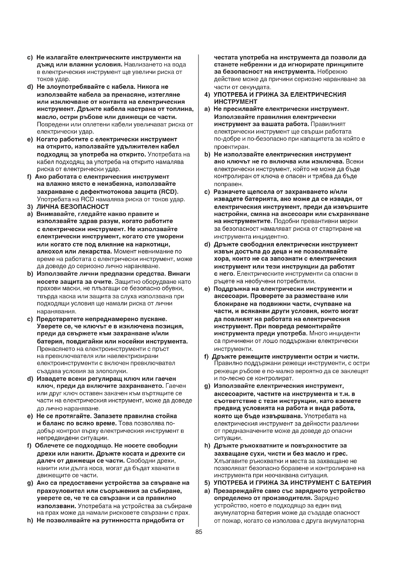 a) Презареждайте само със зарядното устройство определено от производителя. Зарядно устройство, което е подходящо за един вид акумулаторна батерия може да създаде опасност от пожар, когато се използва с друга акумулаторна c) Не излагайте електрическите инструменти на дъжд или влажни условия. Навлизането на вода в електрическия инструмент ще увеличи риска от токов удар. d) Не злоупотребявайте с кабела. Никога не използвайте кабела за пренасяне, изтегляне или изключване от контакта на електрическия инструмент. Дръжте кабела настрана от топлина, масло, остри ръбове или движещи се части. Повредени или оплетени кабели увеличават риска от електрически удар. e) Когато работите с електрически инструмент на открито, използвайте удължителен кабел подходящ за употреба на открито. Употребата на кабел подходящ за употреба на открито намалява риска от електрически удар. f) Ако работата с електрическия инструмент на влажно място е неизбежна, използвайте захранване с дефектнотокова защита (RCD). Употребата на RCD намалява риска от токов удар.