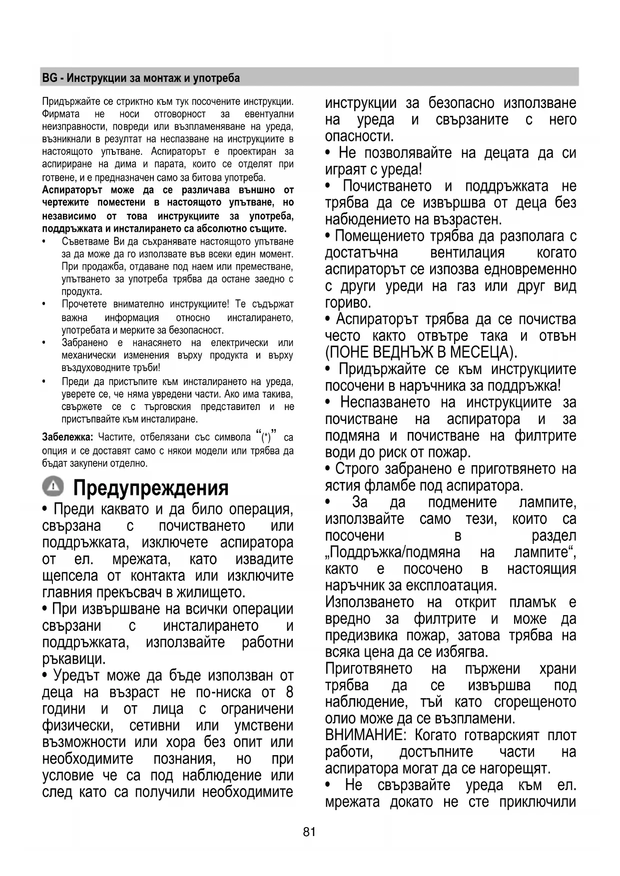 - Аспираторът не трябва НИКОГА да се използва като опорен плот освен ако това не е спец иално указано.
