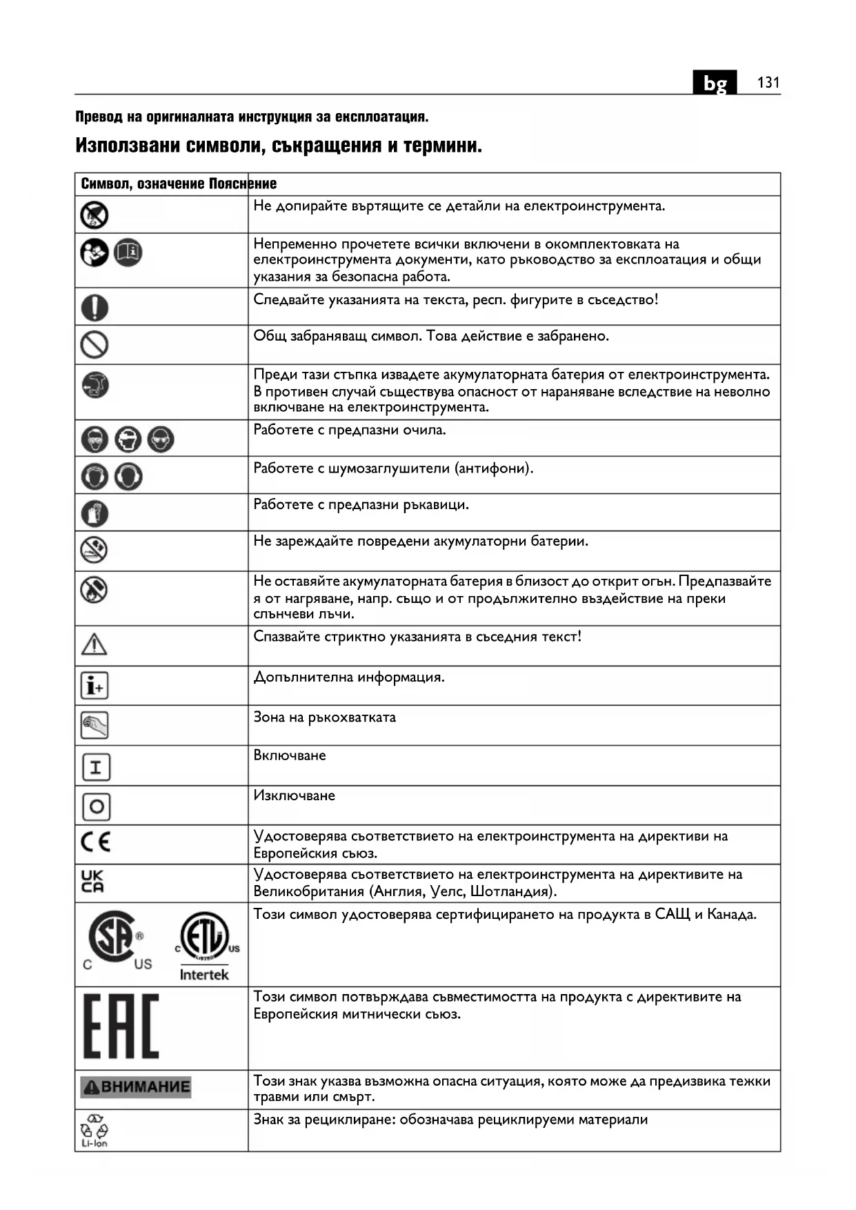 Удостоверява съответствието на електроинструмента на директиви на Европейския съюз. Удостоверява съответствието на електроинструмента на директивите на Великобритания (Англия, Уелс, Шотландия). Този символ удостоверява сертифицирането на продукта в САЩ и Канада. Този символ потвърждава съвместимостта на продукта с директивите на Европейския митнически съюз. Този знак указва възможна опасна ситуация, която може да предизвика тежки травми или смърт. Знак за рециклиране: обозначава рециклируеми материали132