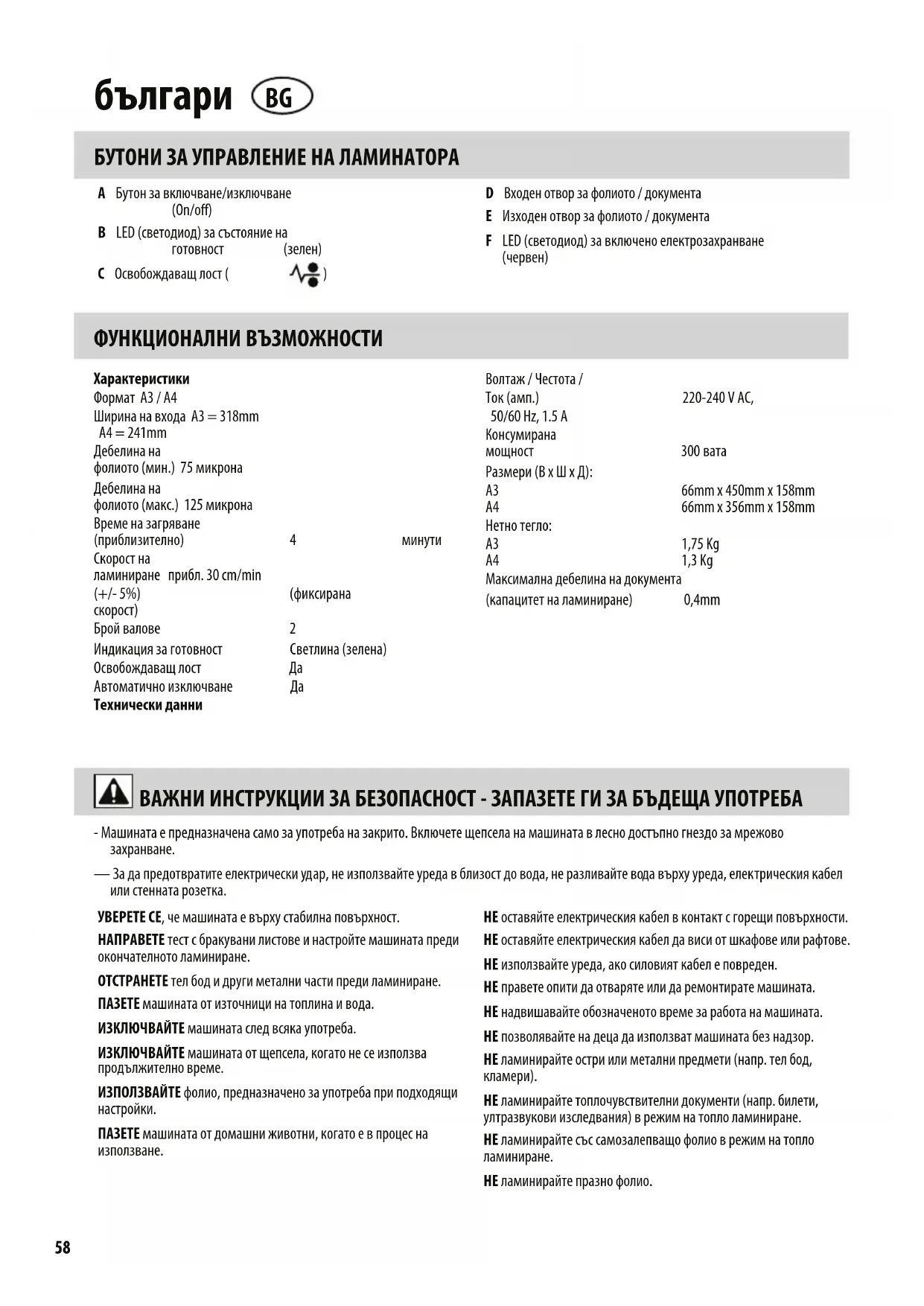 ФУНКЦИОНАЛНИ ВЪЗМОЖНОСТИ - Машината е предназначена само за употреба на закрито. Включете щепсела на машината в лесно достъпно гнездо за мрежово захранване. — За да предотвратите електрически удар, не използвайте уреда в близост до вода, не разливайте вода върху уреда, електрическия кабел или стенната розетка. УВЕРЕТЕ СЕ, че машината е върху стабилна повърхност. НАПРАВЕТЕ тест с бракувани листове и настройте машината преди окончателното ламиниране. ОТСТРАНЕТЕ тел бод и други метални части преди ламиниране. ПАЗЕТЕ машината от източници на топлина и вода. ИЗКЛЮЧВАЙТЕ машината след всяка употреба. ИЗКЛЮЧВАЙТЕ машината от щепсела, когато не се използва продължително време. ИЗПОЛЗВАЙТЕ фолио, предназначено за употреба при подходящи