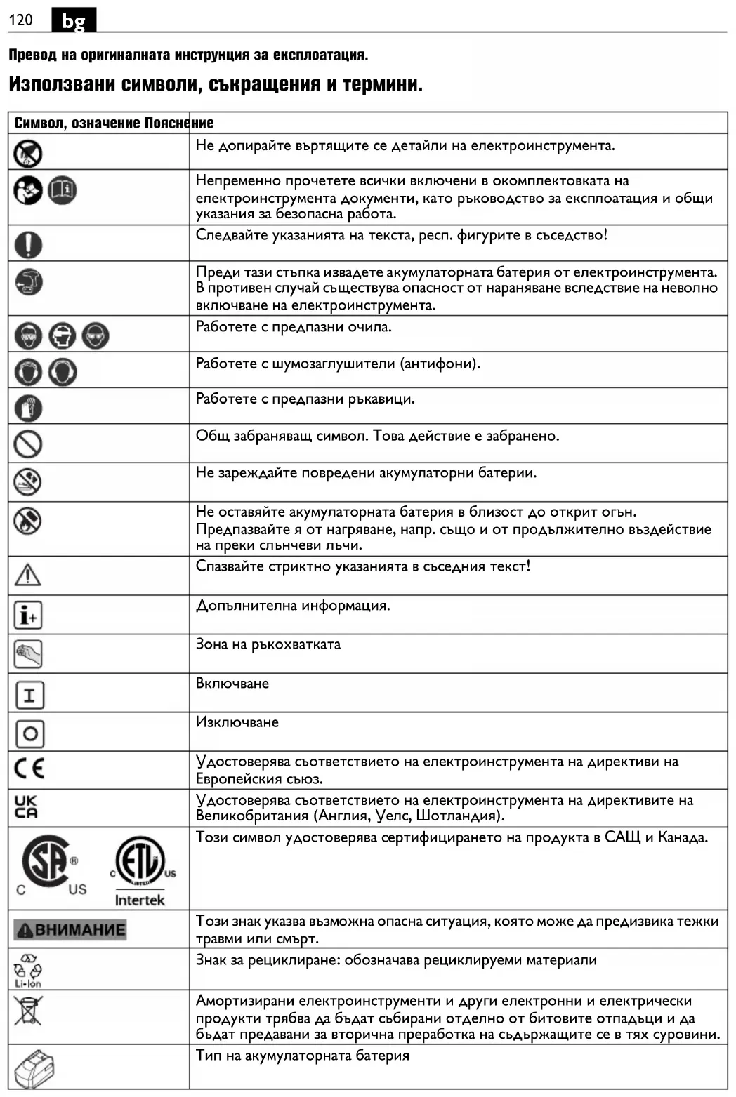 ози знак указва възможна опасна ситуация, която може да предизвика тежки травми или смърт. Знак за рециклиране: обозначава рециклируеми материали Амортизирани електроинструменти и други електронни и електрически продукти трябва да бъдат събирани отделно от битовите отпадъци и да бъдат предавани за вторична преработка на съдържащите се в тях суровини. Тип на акумулаторната батерия121
