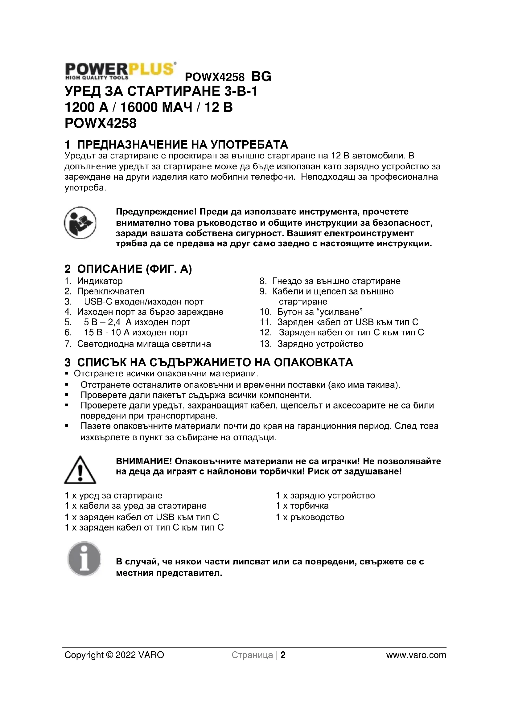 8 ТЕХНИЧЕСКИ ДАННИ .................................................................. 7 9 ОКОЛНА СРЕДА ............................................................................ 7 10 ДЕКЛАРАЦИЯ ЗА СЪОТВЕТСТВИЕ .......................................... 8POWX4258 BG Copyright © 2022 VARO Страница | 2 www.varo.com УРЕД ЗА СТАРТИРАНЕ 3-В-1 1200 A / 16000 МАЧ / 12 В POWX4258 1 ПРЕДНАЗНАЧЕНИЕ НА УПОТРЕБАТА Уредът за стартиране е проектиран за външно стартиране на 12 В автомобили. В допълнение уредът за стартиране може да бъде използван като зарядно устройство за зареждане на други изделия като мобилни телефони. Неподходящ за професионална