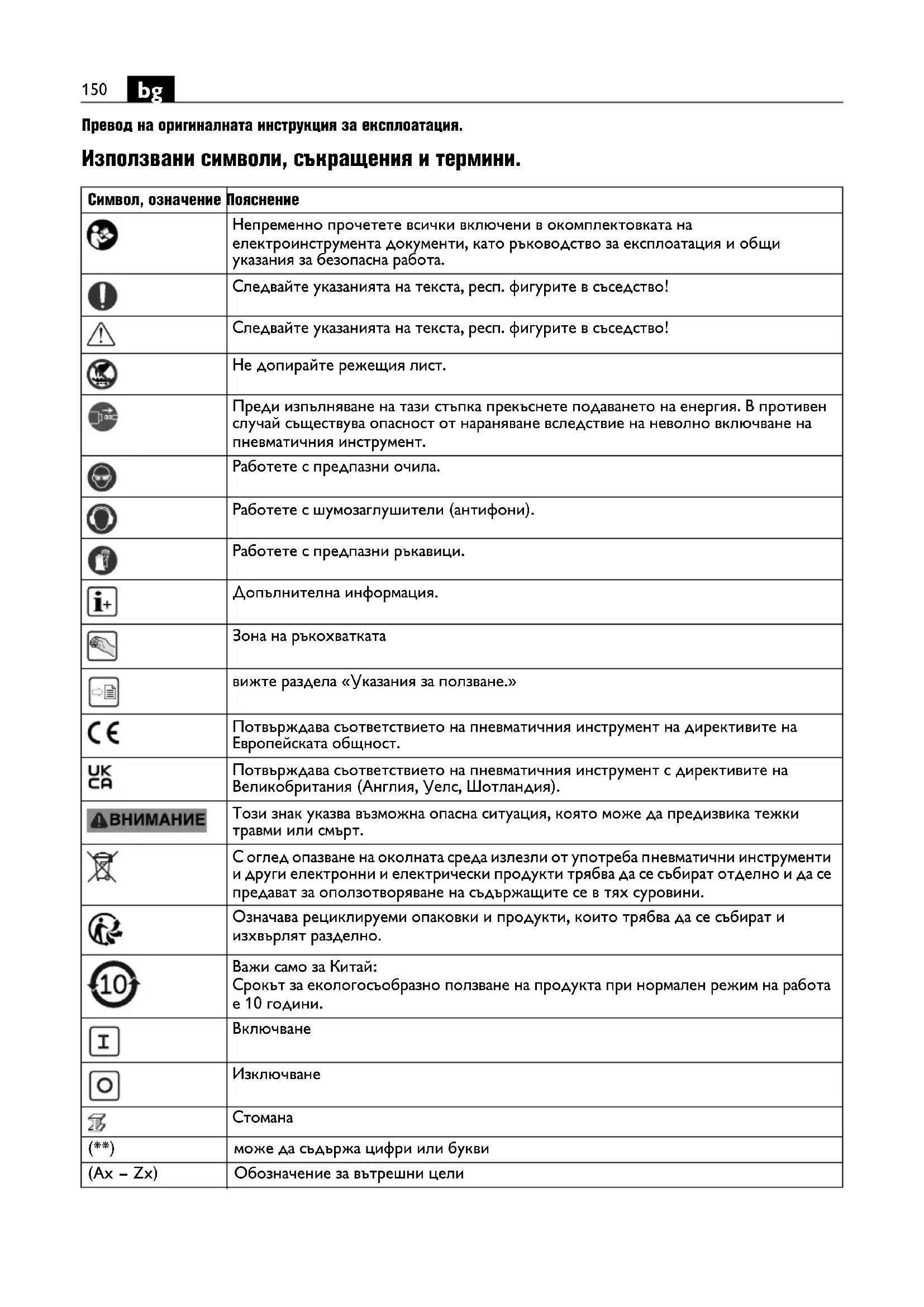 Превод на оригиналната инструкция за експлоатация. Използвани символи, съкращения и термини. Символ, означение Пояснение Непременно прочетете всички включени в окомплектовката на електроинструмента документи, като ръководство за експлоатация и общи указания за безопасна работа. Следвайте указанията на текста, респ. фигурите в съседство! Следвайте указанията на текста, респ. фигурите в съседство! Не допирайте режещия лист. Преди изпълняване на тази стъпка прекъснете подаването на енергия. В противен случай съществува опасност от нараняване вследствие на неволно включване на пневматичния инструмент. Работете с предпазни очила. Работете с шумозаглушители (антифони). Работете с предпазни ръкавици. Допълнителна информация. Зона на ръкохватката вижте раздела «Указания за ползване.» Потвърждава съответствието на пневматичния инструмент на директивите на Европейската общност. Потвърждава съответствието на пневматичния инструмент с директивите на Великобритания (Англия, Уелс, Шотландия). Този знак указва възможна опасна ситуация, която може да предизвика тежки травми или смърт. С оглед опазване на околната среда излезли от употреба пневматични инструменти и други електронни и електрически продукти трябва да се събират отделно и да се предават за оползотворяване на съдържащите се в тях суровини. Означава рециклируеми опаковки и продукти, които трябва да се събират и изхвърлят разделно. Важи само за Китай: Срокът за екологосъобразно ползване на продукта при нормален режим на работа е 10 години.