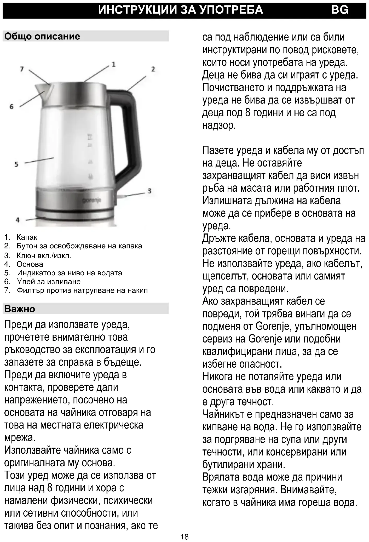 Дръжте кабела, основата и уреда на разстояние от горещи повърхности. Не използвайте уреда, ако кабелът, щепселът, основата или самият уред са повредени. Ако захранващият кабел се повреди, той трябва винаги да се подменя от Gorenje, упълномощен сервиз на Gorenje или подобни квалифицирани лица, за да се избегне опасност. Никога не потапяйте уреда или основата във вода или каквато и да е друга течност. Чайникът е предназначен само за кипване на вода. Не го използвайте за подгряване на супа или други течности, или консервирани или бутилирани храни. Врялата вода може да причини тежки изгаряния. Внимавайте, когато в чайника има гореща вода.19 Никога не запълвайте чайника над знака за максимално ниво. Ако чайникът е препълнен, от улея за изливане може да се изплиска вряла вода и да причини изгаряне. Не отваряйте капака, докато водата кипи. Внимавайте, когато отваряте капака непосредствено след завирането на водата излизащата от чайника пара е много гореща. Избягвайте да докосвате тялото на чайника, тъй като то се нагорещява много по време на работа. Винаги вдигайте чайника за