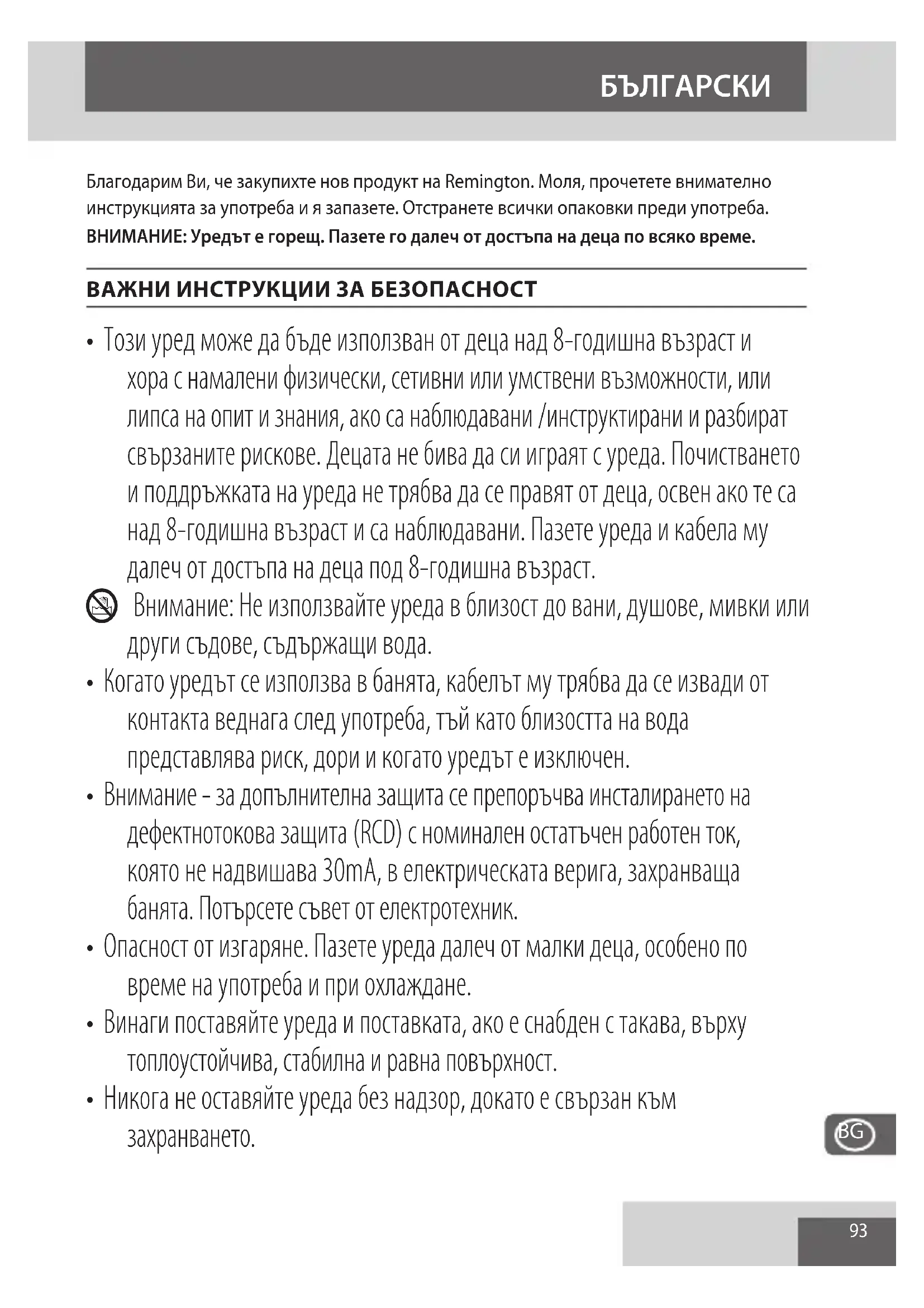 - Ако кабелът се повреди, незабавно прекратете употребата и върнете уреда в най-близкия до Вас оторизиран сервиз на Remington за поправка или замяна, за да се избегнат рискове.