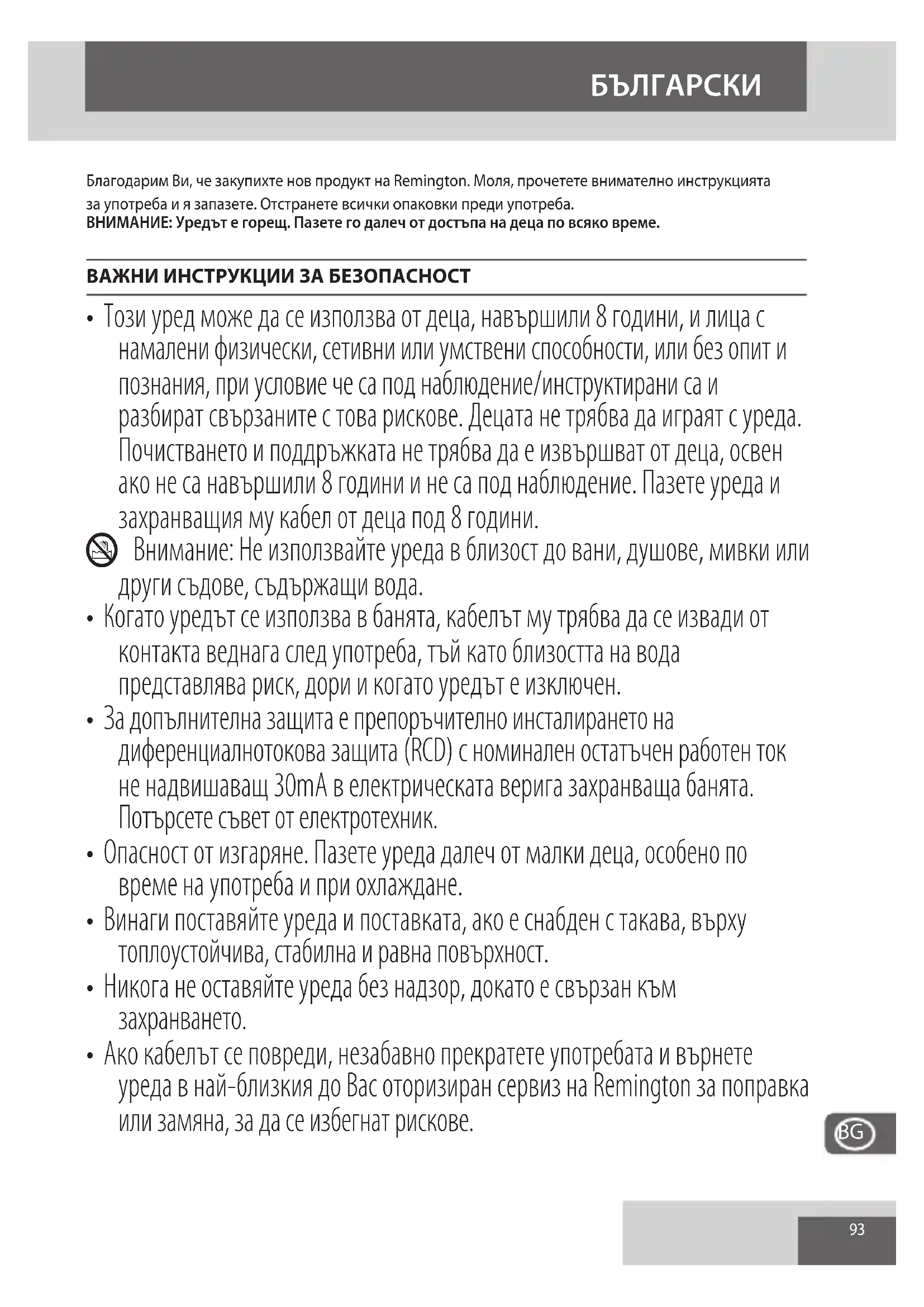 - Ако кабелът се повреди, незабавно прекратете употребата и върнете уреда в най-близкия до Вас оторизиран сервиз на Remington за поправка или замяна, за да се избегнат рискове.