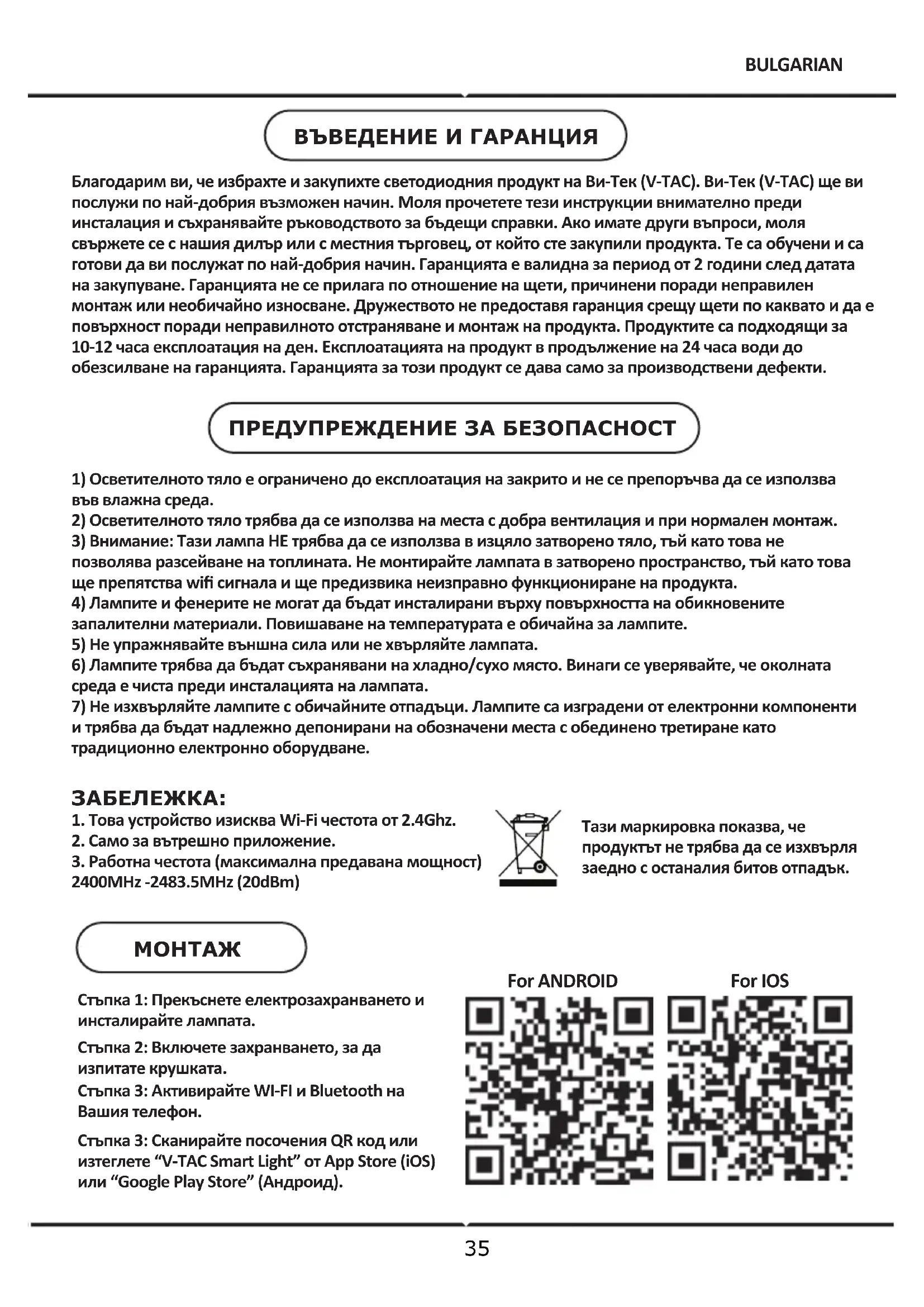Стъпка 1: Прекъснете електрозахранването и инсталирайте лампата. Стъпка 2: Включете захранването, за да изпитате крушката. Стъпка 3: Активирайте WI-FI и Вluetooth на Вашия телефон. Стъпка 3: Сканирайте посочения QR код или изтеглете “V-TAC Smart Light” от App Store (iOS) или “Google Play Store” (Андроид). For ANDROID For IOS Тази маркировка показва, че продуктът не трябва да се изхвърля заедно с останалия битов отпадък.