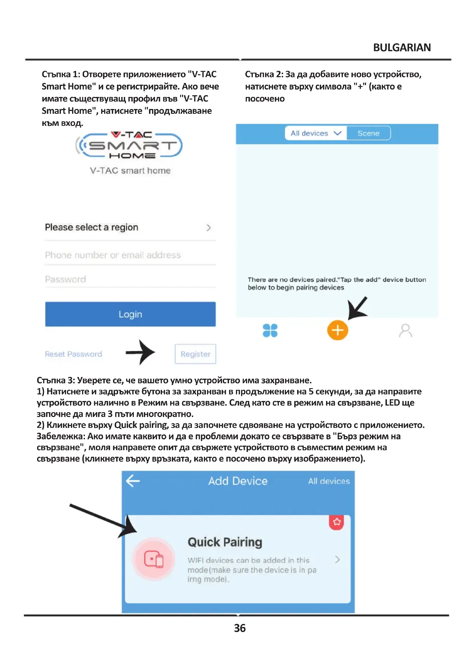 BULGARIAN Стъпка 3: Уверете се, че Умното устройство е свързано с приложение "V-TAC Smart Home" преди започването на стъпка 3. Натиснете върху раздела със стрелката, както е посочено в изображението