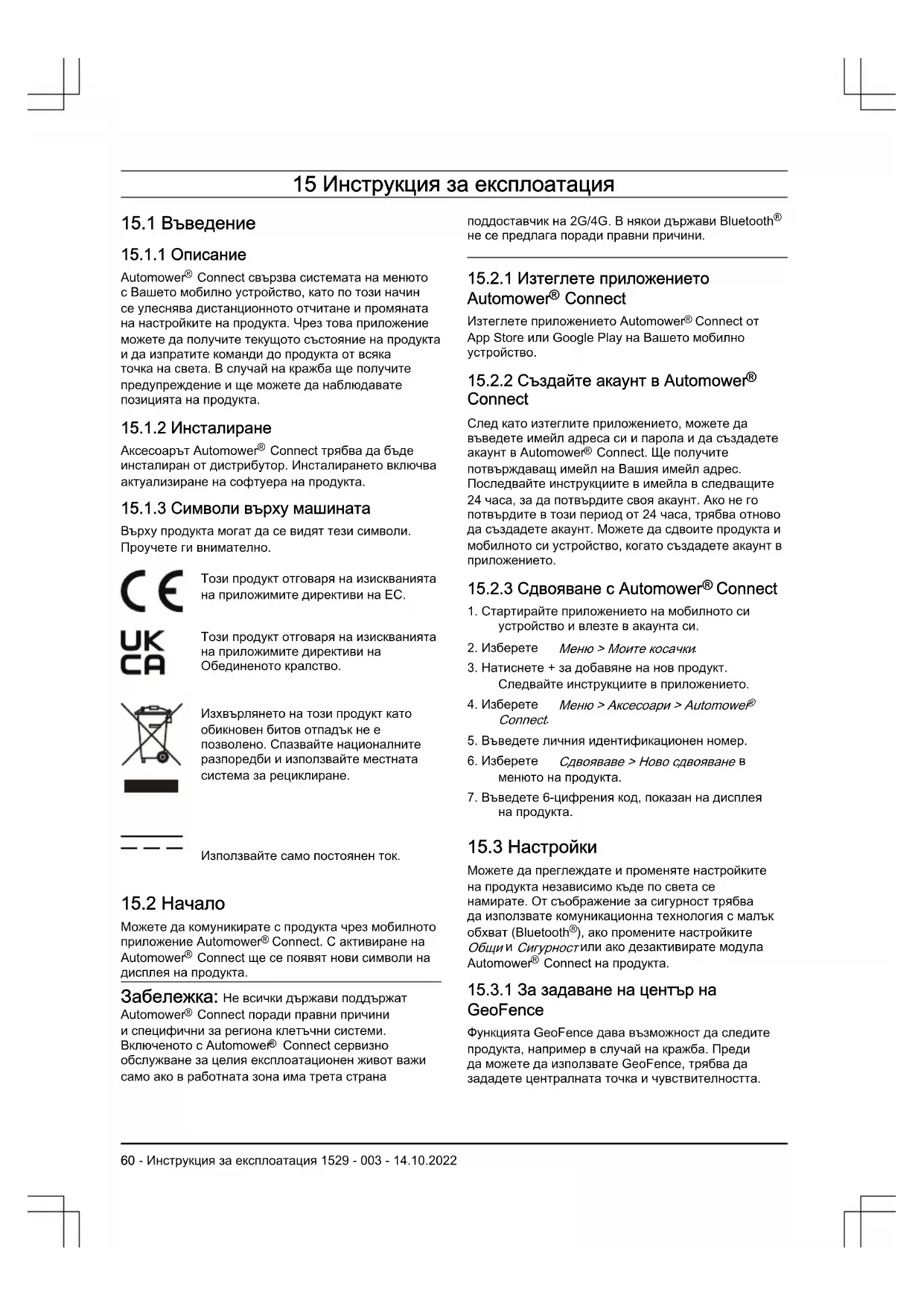 Можете да комуникирате с продукта чрез мобилнотоприложение Automower Connect. С активиране наAutomower Connect ще се появят нови символи надисплея на продукта. Не всички държави поддържатAutomower Connect поради правни причинии специфични за региона клетъчни системи.Включеното с Automower Connect сервизнообслужване за целия експлоатационен живот важисамо ако в работната зона има трета странаподдоставчик на 2G/4G. В някои държави Bluetooth не се предлага поради правни причини.