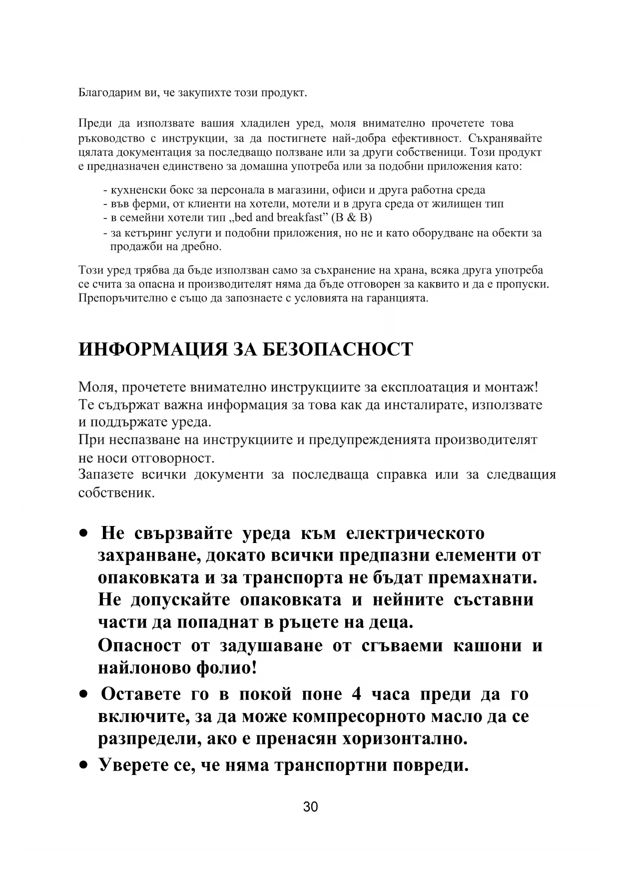 Благодарим ви, че закупихте този продукт. Преди да използвате вашия хладилен уред, моля внимателно прочетете това ръководство с инструкции, за да постигнете най-добра ефективност. Съхранявайте цялата документация за последващо ползване или за други собственици. Този продукт е предназначен единствено за домашна употреба или за подобни приложения като: - кухненски бокс за персонала в магазини, офиси и друга работна среда - във ферми, от клиенти на хотели, мотели и в друга среда от жилищен тип - в семейни хотели тип „bed and breakfast” (B & B) - за кетъринг услуги и подобни приложения, но не и като оборудване на обекти за продажби на дребно. Този уред трябва да бъде използван само за съхранение на храна, всяка друга употреба се счита за опасна и производителят няма да бъде отговорен за каквито и да е пропуски. Препоръчително е също да запознаете с условията на гаранцията. ИНФОРМАЦИЯ ЗА БЕЗОПАСНОСТ Моля, прочетете внимателно инструкциите за експлоатация и монтаж! Те съдържат важна информация за това как да инсталирате, използвате и поддържате уреда. При неспазване на инструкциите и предупрежденията производителят не носи отговорност. Запазете всички документи за последваща справка или за следващия собственик.