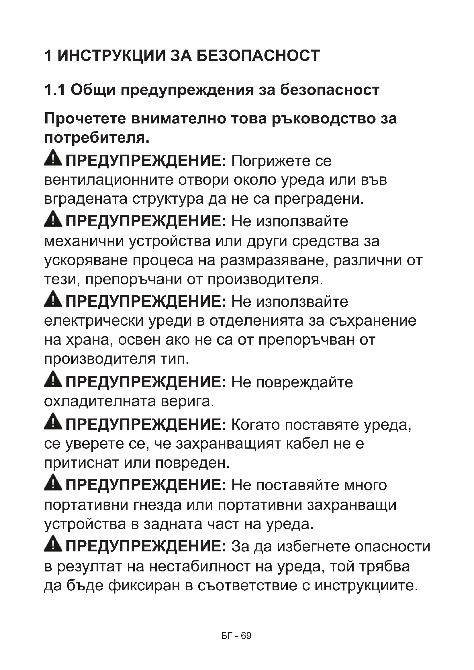 Прочетете внимателно това ръководство за потребителя. ПРЕДУПРЕЖДЕНИЕ: Погрижете се вентилационните отвори около уреда или във вградената структура да не са преградени. ПРЕДУПРЕЖДЕНИЕ: Не използвайте механични устройства или други средства за ускоряване процеса на размразяване, различни от тези, препоръчани от производителя. ПРЕДУПРЕЖДЕНИЕ: Не използвайте електрически уреди в отделенията за съхранение на храна, освен ако не са от препоръчван от производителя тип. ПРЕДУПРЕЖДЕНИЕ: Не повреждайте охладителната верига. ПРЕДУПРЕЖДЕНИЕ: Когато поставяте уреда, се уверете се, че захранващият кабел не е притиснат или повреден. ПРЕДУПРЕЖДЕНИЕ: Не поставяйте много портативни гнезда или портативни захранващи устройства в задната част на уреда. ПРЕДУПРЕЖДЕНИЕ: За да избегнете опасности в резултат на нестабилност на уреда, той трябва да бъде фиксиран в съответствие с инструкциите.БГ - 70 Ако Вашият уред използва R600a като хладилен агент (тази информация ще бъде предоставена на етикета на охладителя), трябва да се погрижите по време на транспортирането и монтажа да предотвратите повреждането на елементите на охладителя. Освен това R600a е безопасен за околната среда неутрален газ, но притежава експлозивни свойства. В случай на течове поради повреда на елементите на охладителя, преместете Вашия хладилник далеч от открит пламък или източници на нагряване и проветрете стаята, където се намира уредът за няколко минути.